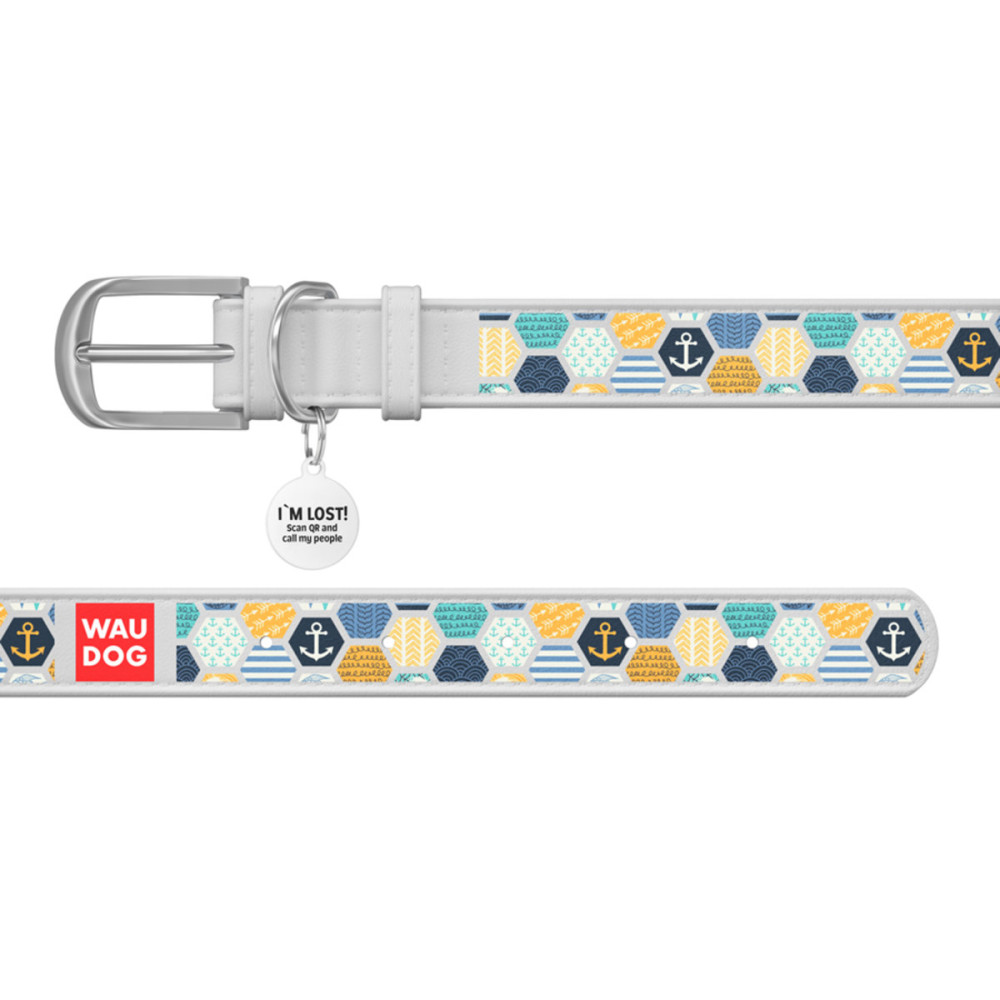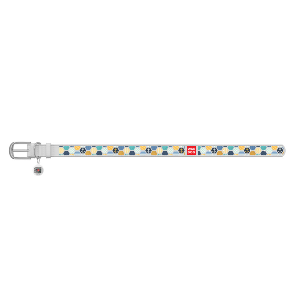 Кожаный белый ошейник для собак WAUDOG Design с рисунком "Морской 2" и металлической пряжкой – это идеальный выбор для собак любых пород.