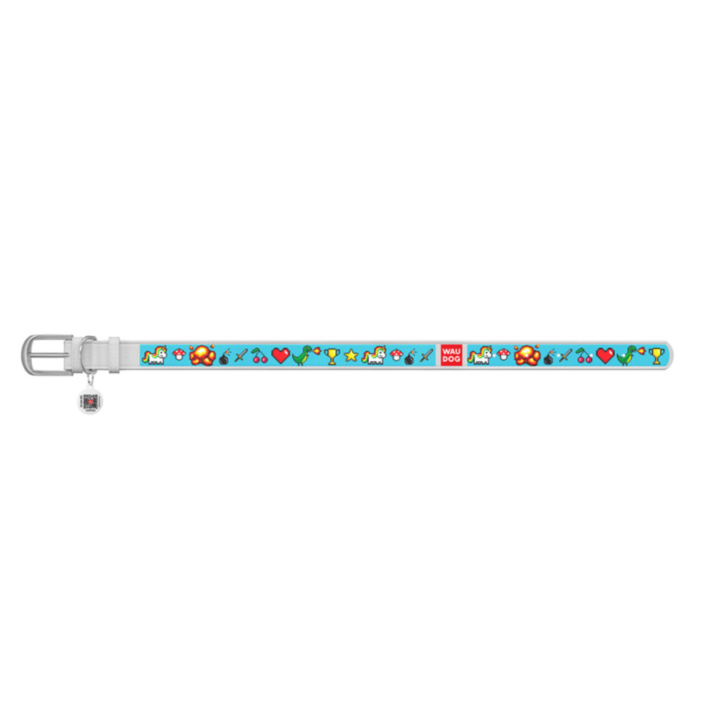 Кожаный белый ошейник для собак WAUDOG Design с рисунком "Пиксельный единорог" и металлической пряжкой – это идеальный выбор для собак любых пород.