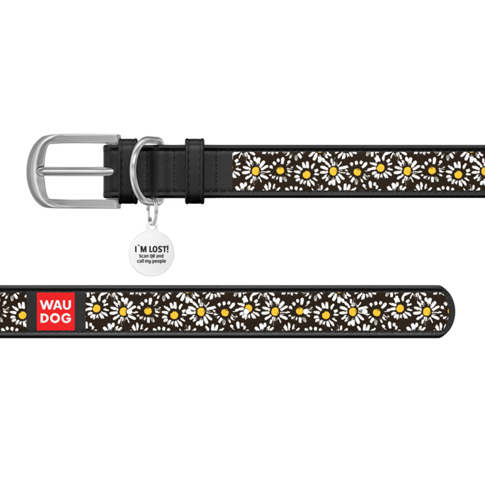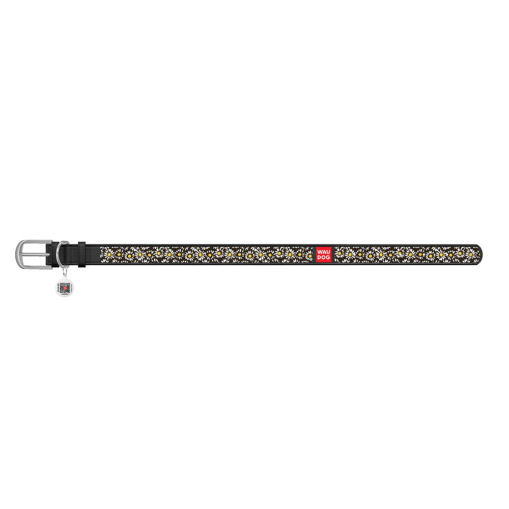 Кожаный чёрный ошейник для собак WAUDOG Design с рисунком "Ромашка" и металлической пряжкой – это идеальный выбор для собак любых пород.