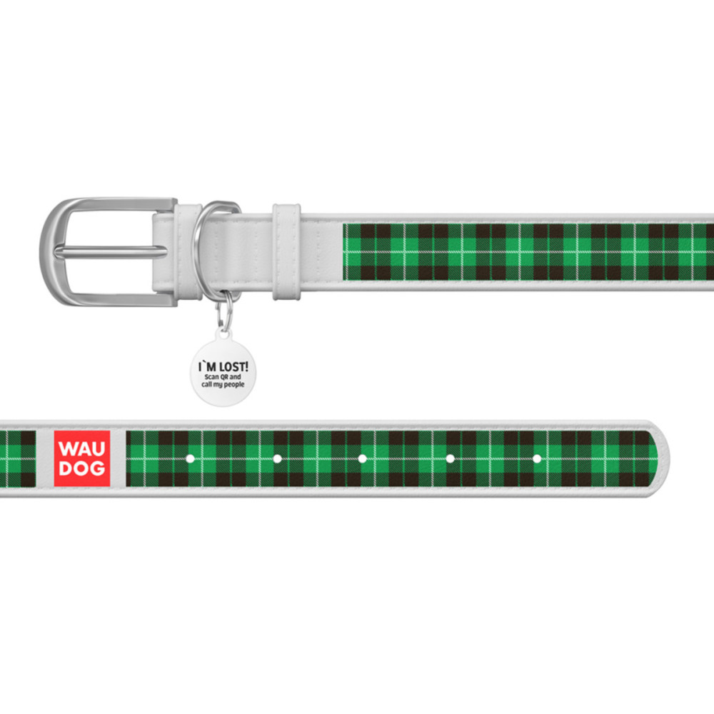 Кожаный белый ошейник для собак WAUDOG Design с рисунком "Шотландка зеленая" и металлической пряжкой – это идеальный выбор для собак любых пород.