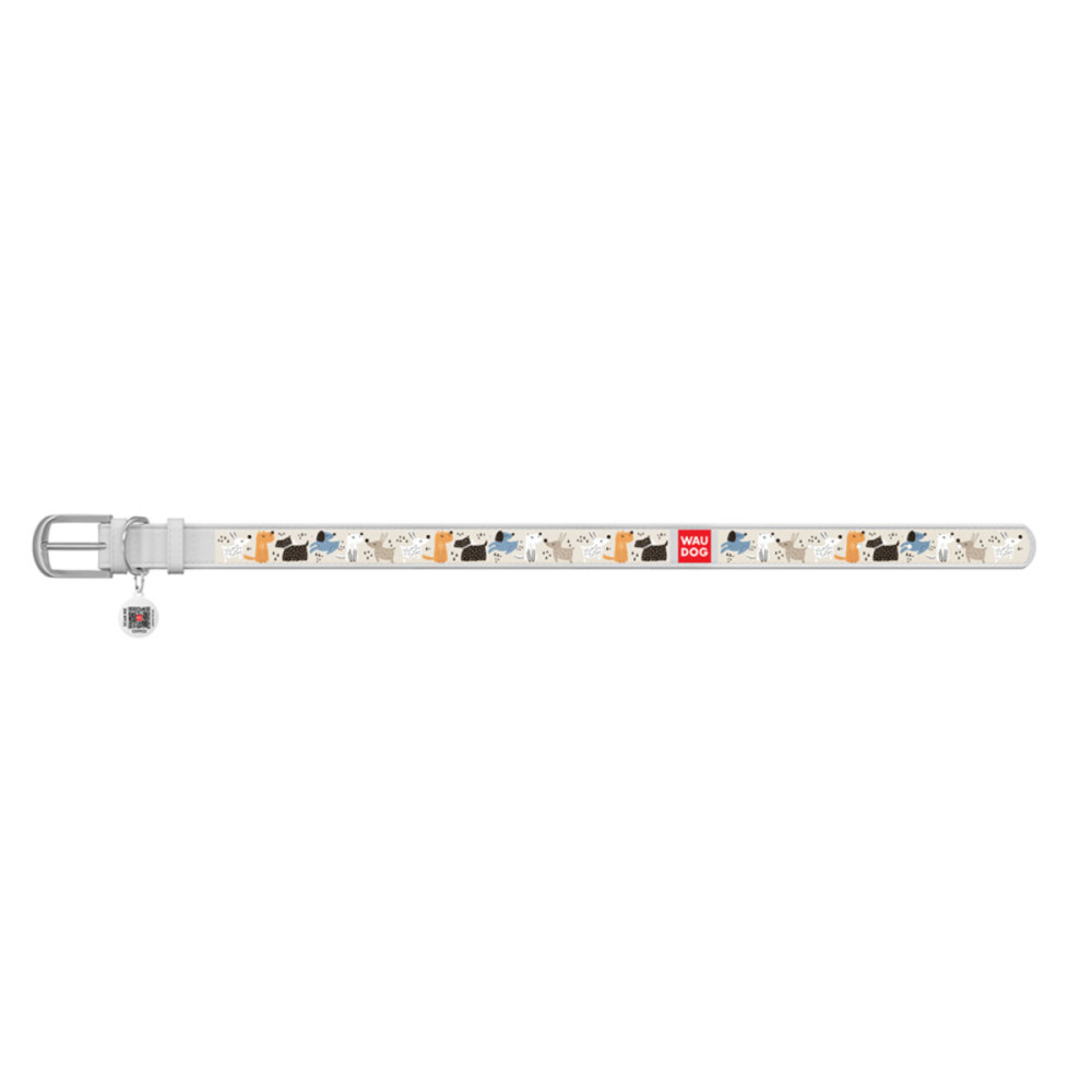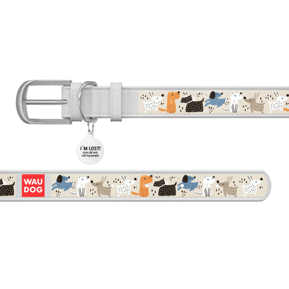 Кожаный белый ошейник для собак WAUDOG Design с рисунком "Собачки на прогулке" и металлической пряжкой – это идеальный выбор для собак любых пород.