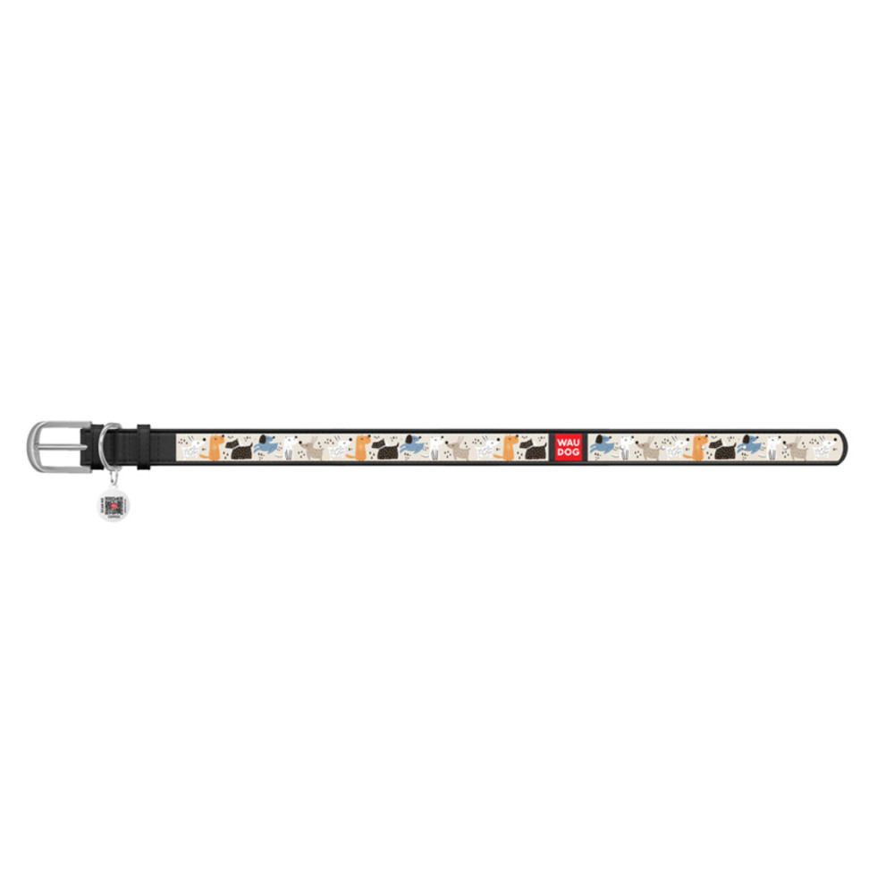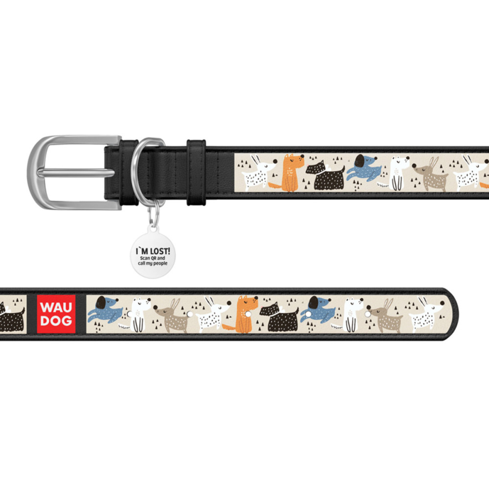 Кожаный чёрный ошейник для собак WAUDOG Design с рисунком "Собаки на прогулке" и металлической пряжкой – это идеальный выбор для собак любых пород.