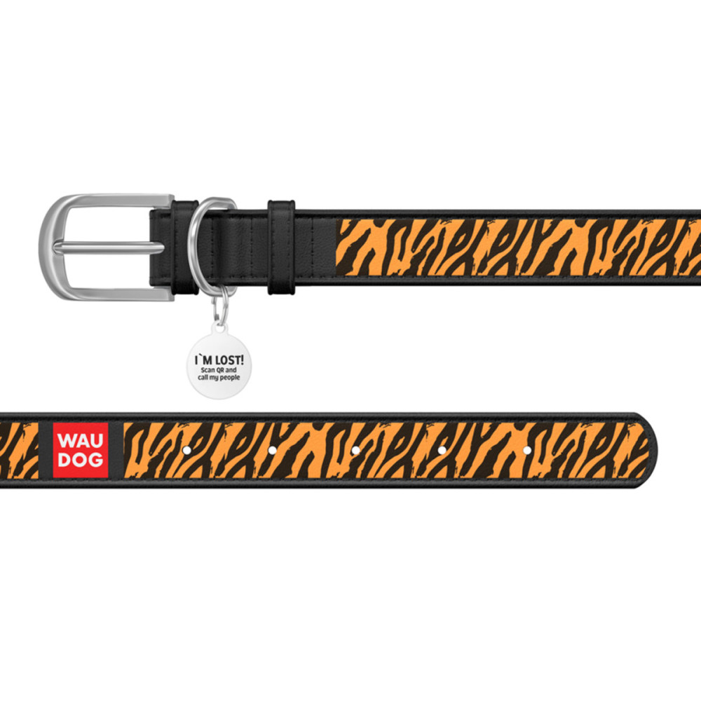 Кожаный чёрный ошейник для собак WAUDOG Design с рисунком "Тигр" и металлической пряжкой – это идеальный выбор для собак любых пород.