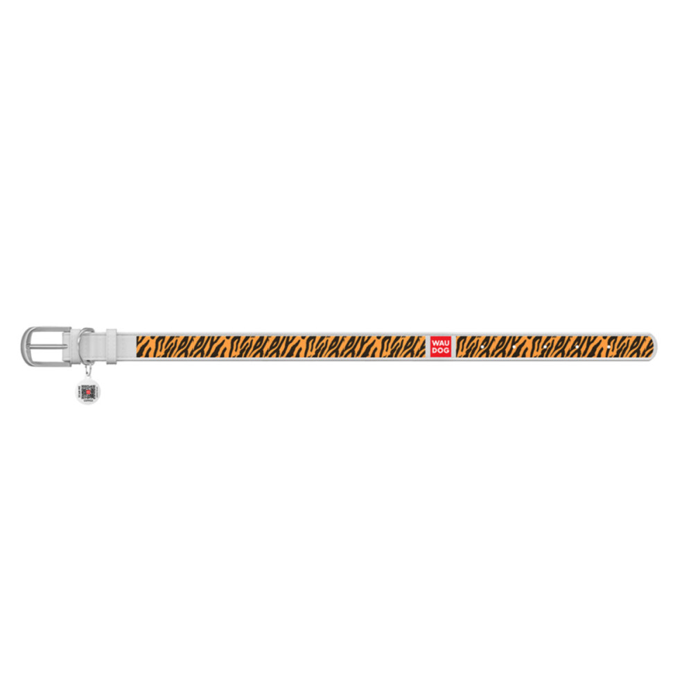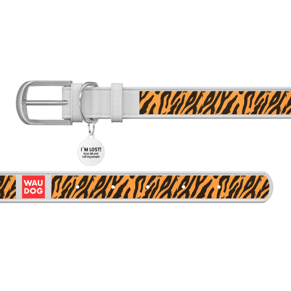 Кожаный белый ошейник для собак WAUDOG Design с рисунком "Тигр" и металлической пряжкой – это идеальный выбор для собак любых пород.