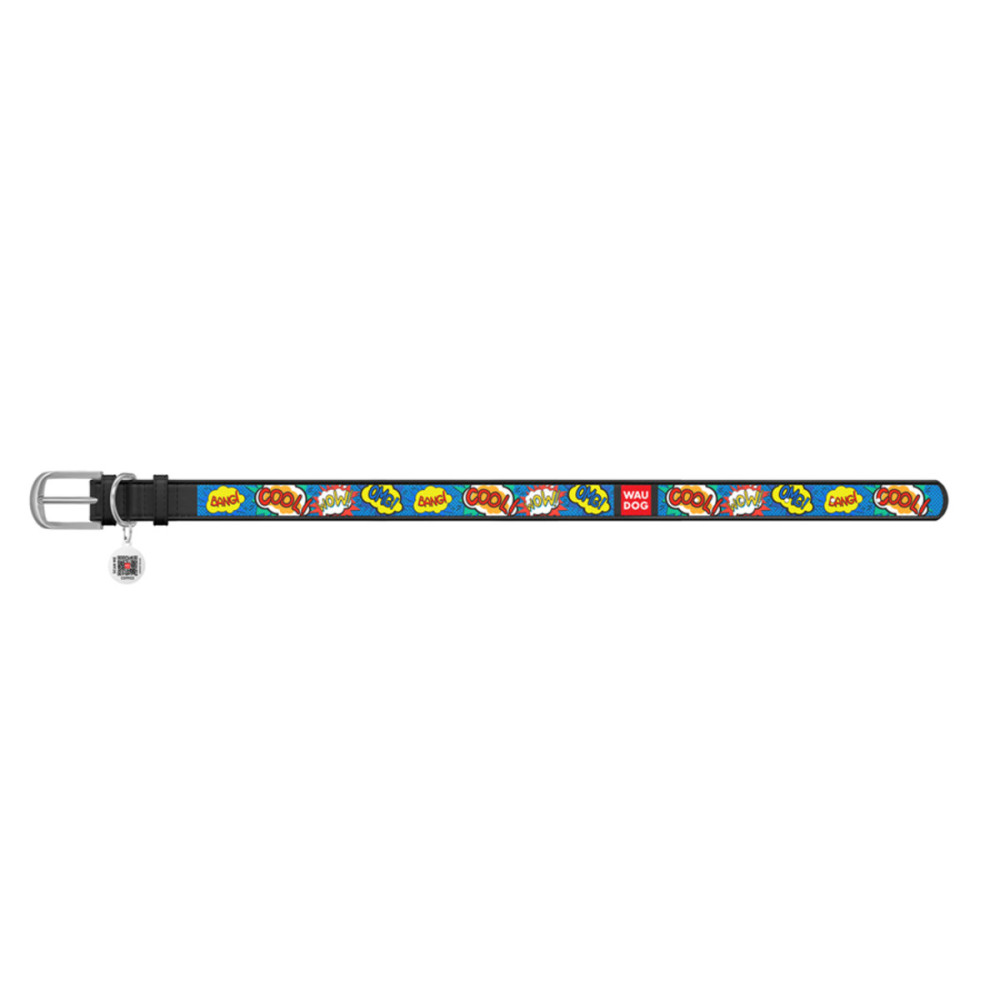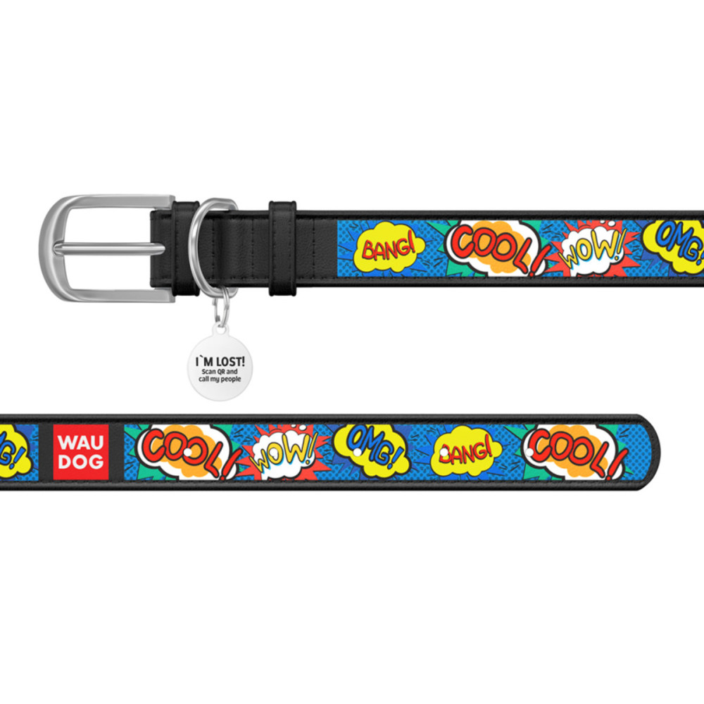 Кожаный чёрный ошейник для собак WAUDOG Design с рисунком "ВАУ" и металлической пряжкой – это идеальный выбор для собак любых пород.
