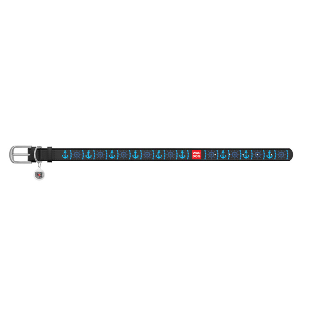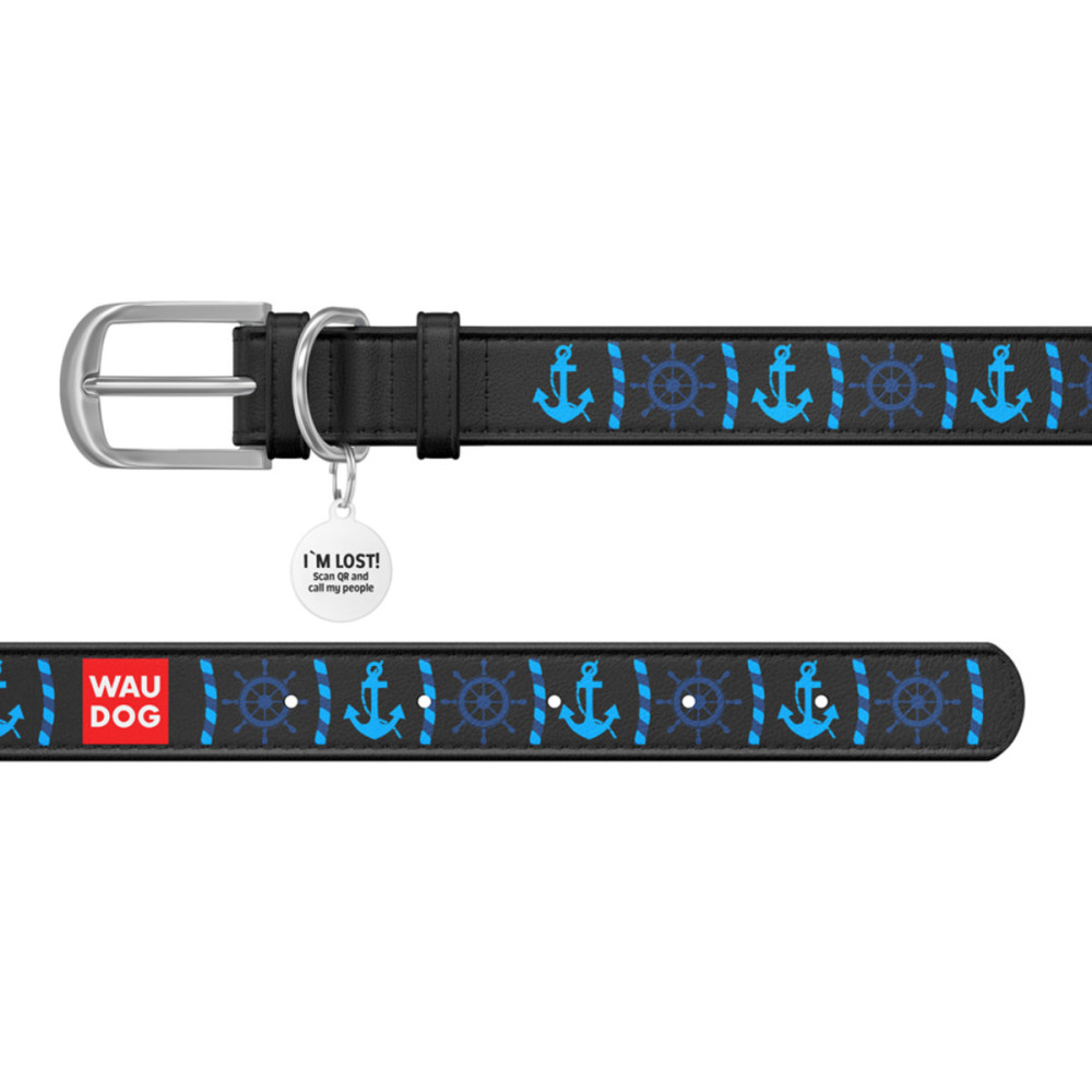 Кожаный чёрный ошейник для собак WAUDOG Design с рисунком "Якоря" и металлической пряжкой – это идеальный выбор для собак любых пород.