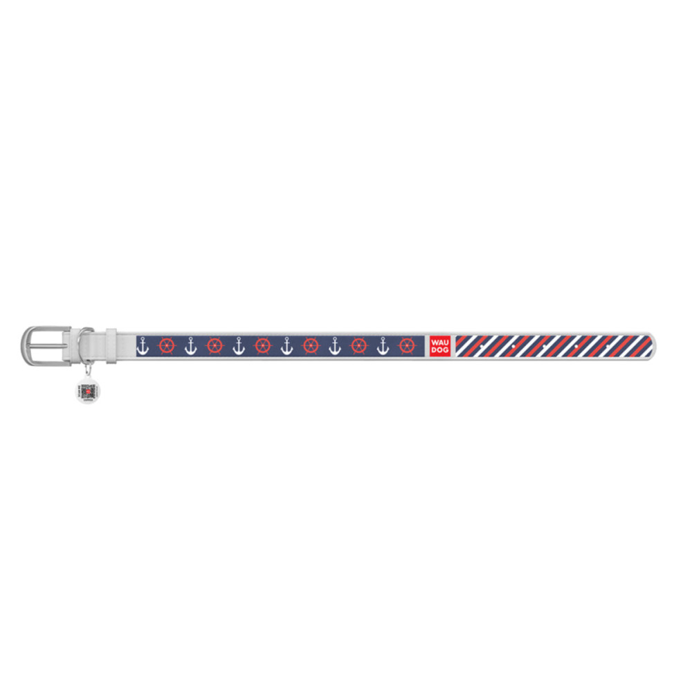 Кожаный белый ошейник для собак WAUDOG Design с рисунком "Якоря 2" и металлической пряжкой – это идеальный выбор для собак любых пород.