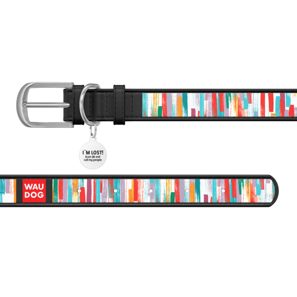 Кожаный чёрный ошейник для собак WAUDOG Design с рисунком "Яркие полоски" и металлической пряжкой – это идеальный выбор для собак любых пород.