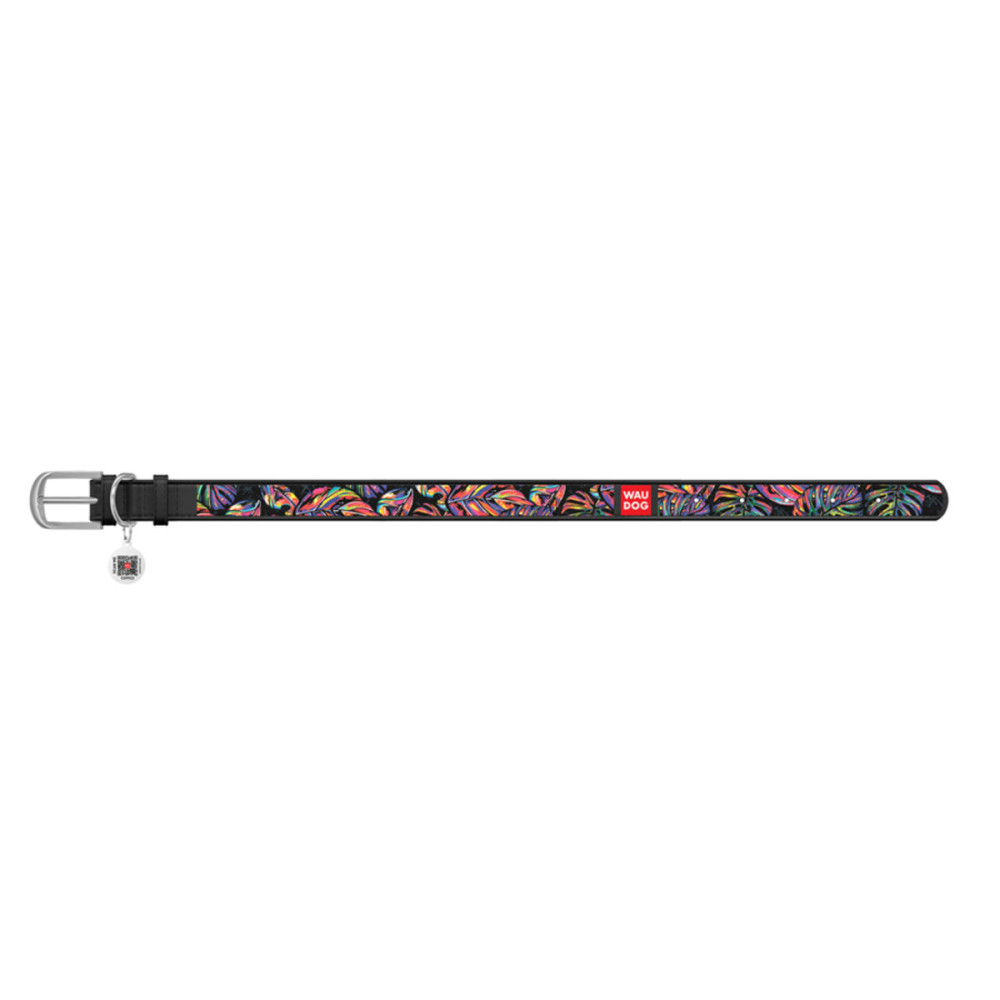 Кожаный чёрный ошейник для собак WAUDOG Design с рисунком "Яркий тропик" и металлической пряжкой – это идеальный выбор для собак любых пород.