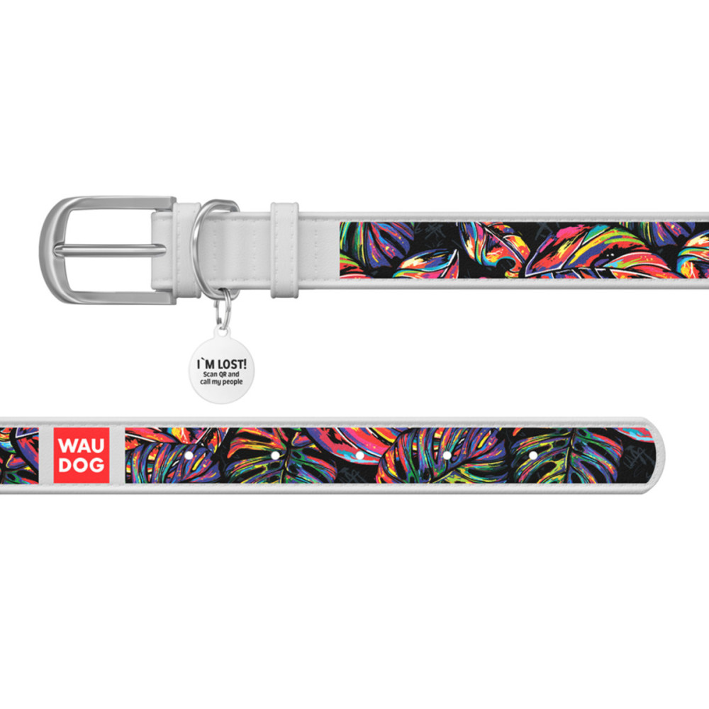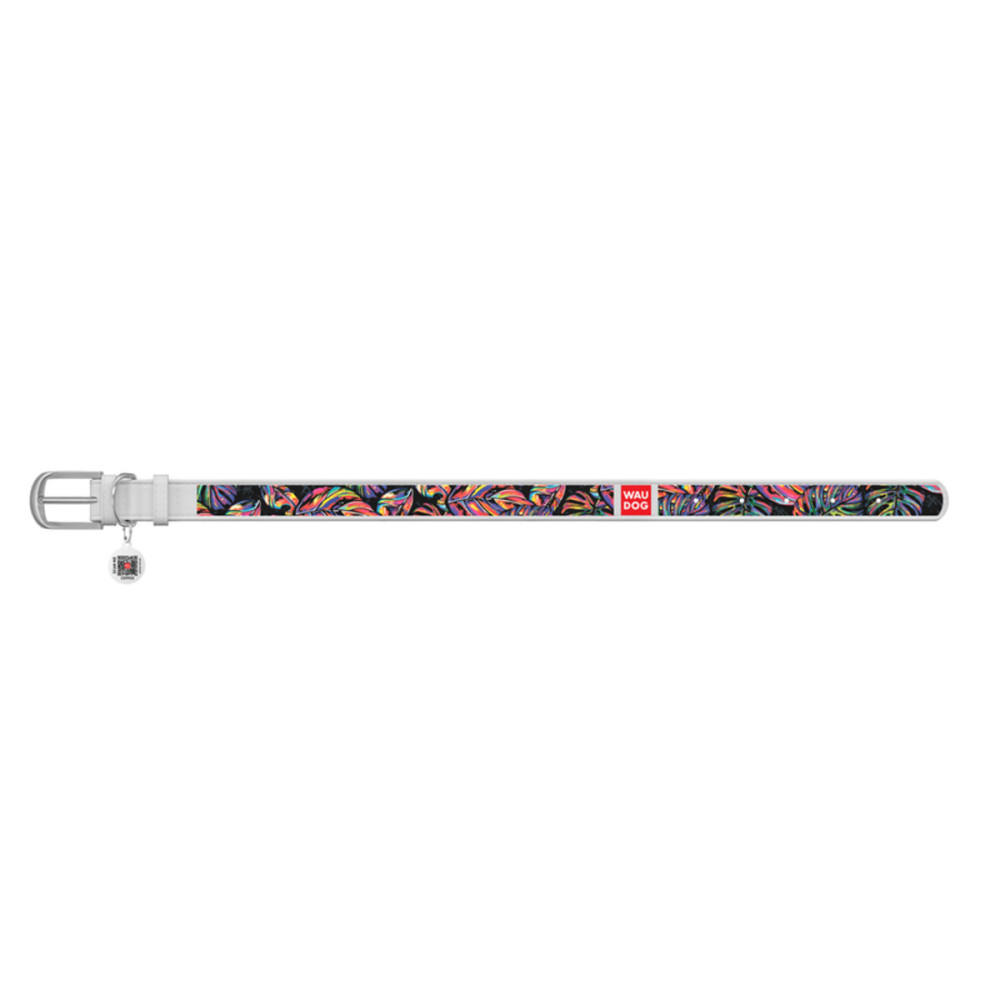 Кожаный белый ошейник для собак WAUDOG Design с рисунком "Яркий тропик" и металлической пряжкой – это идеальный выбор для собак любых пород.
