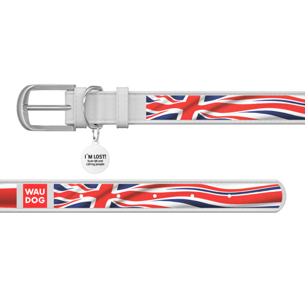 Кожаный белый ошейник для собак WAUDOG Design с рисунком "Юнион Джек" и металлической пряжкой – это идеальный выбор для собак любых пород.