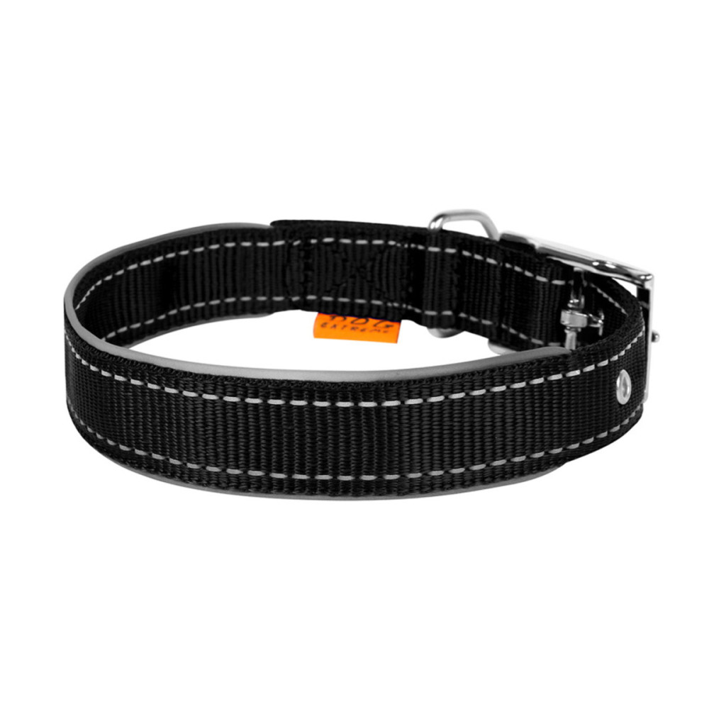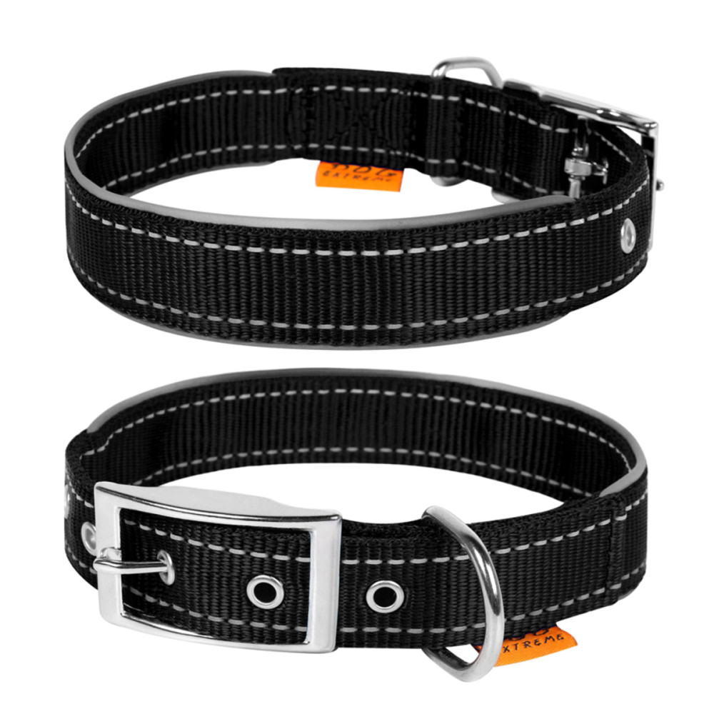 Длина двойного нейлонового ошейника для собак Dog Extremе со светоотражающей вставкой чёрного цвета подбирается в соответствии с охватом шеи хвостатого друга, который определяют измерительной лентой. При этом правильно добавлять к полученному результату от 2 см (для средних и мелких пород) до 5 см (для больших), чтобы ошейник не натирал и не сдавливал шею животного.