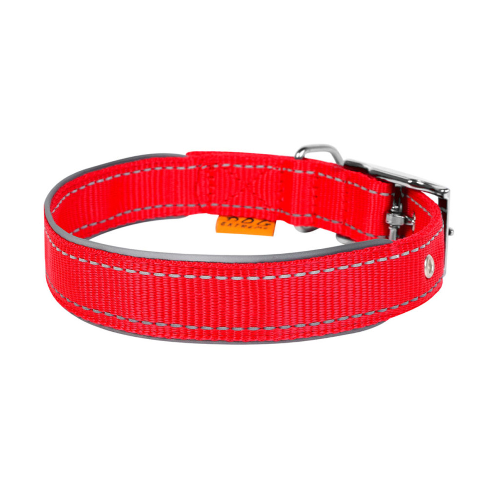 Длина двойного нейлонового ошейника для собак Dog Extremе со светоотражающей вставкой красного цвета подбирается в соответствии с охватом шеи хвостатого друга, который определяют измерительной лентой. При этом правильно добавлять к полученному результату от 2 см (для средних и мелких пород) до 5 см (для больших), чтобы ошейник не натирал и не сдавливал шею животного.
