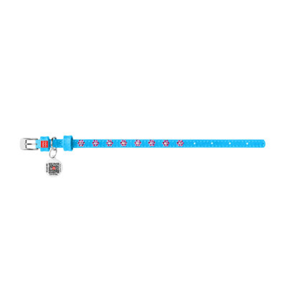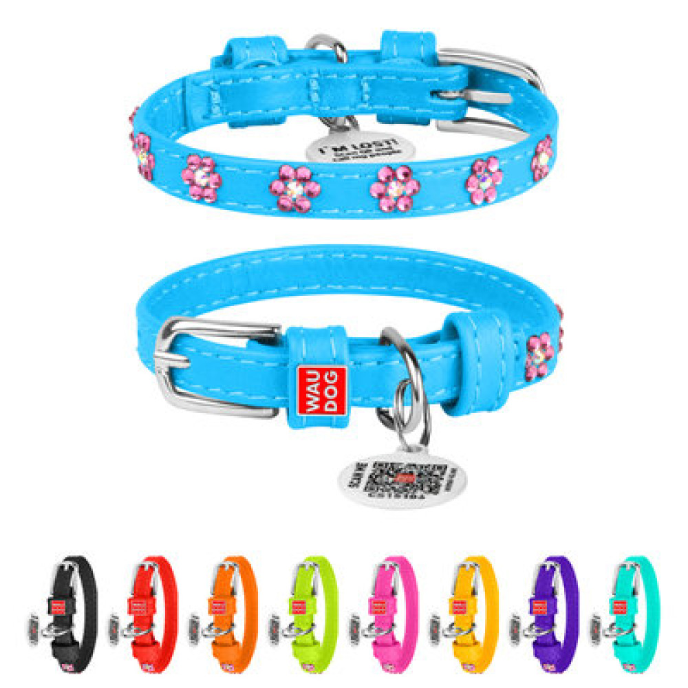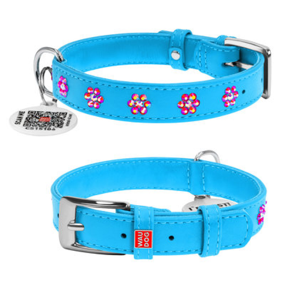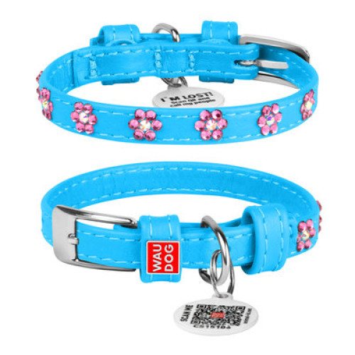 Нежный голубой цвет в сочетании с декоративными стразами в форме цветков делает этот ошейник выразительным. Мягкая натуральная кожа не вызывает раздражения, а QR жетон помогает быстро вернуть питомца, если он потеряется.