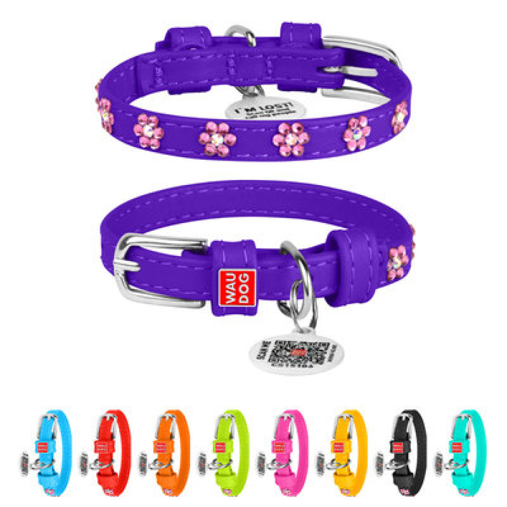 Ошейник для собак WAUDOG Glamour кожаный фиолетовый со стразами "Цветы" и QR паспортом