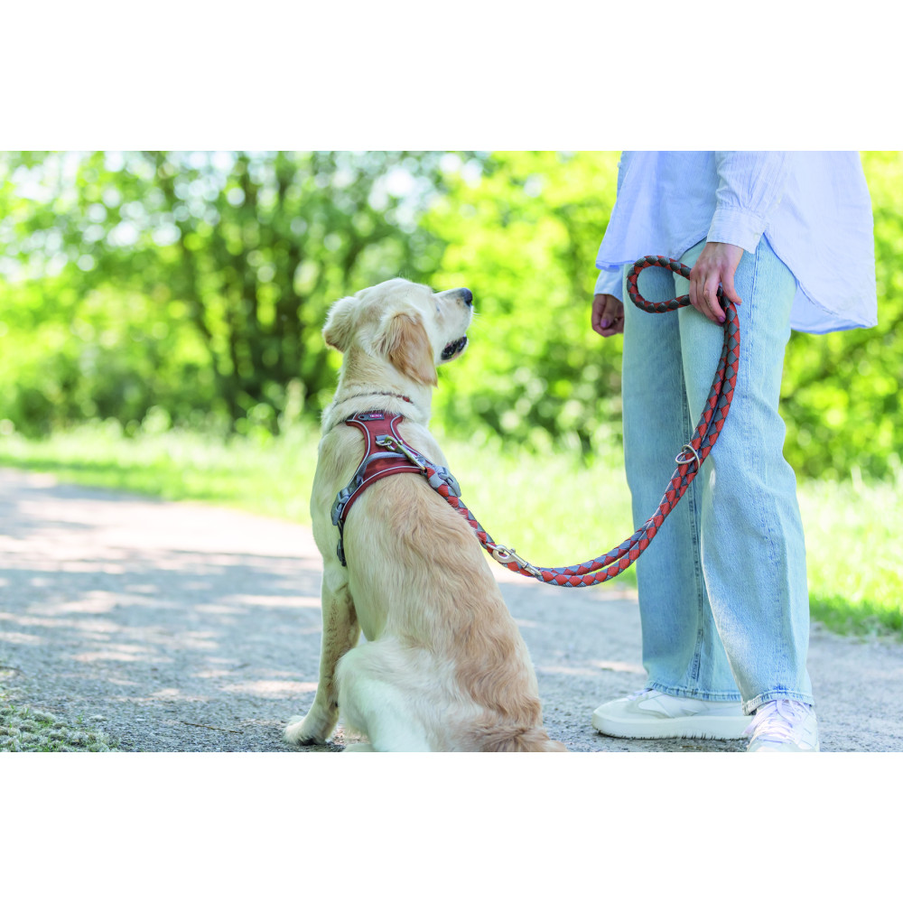 Благодаря продуманной системе колец и карабинов, длину поводка можно легко настроить для разных ситуаций: максимальная длина для свободных прогулок, средняя для контроля в городе или короткая для тренировок и движения рядом.