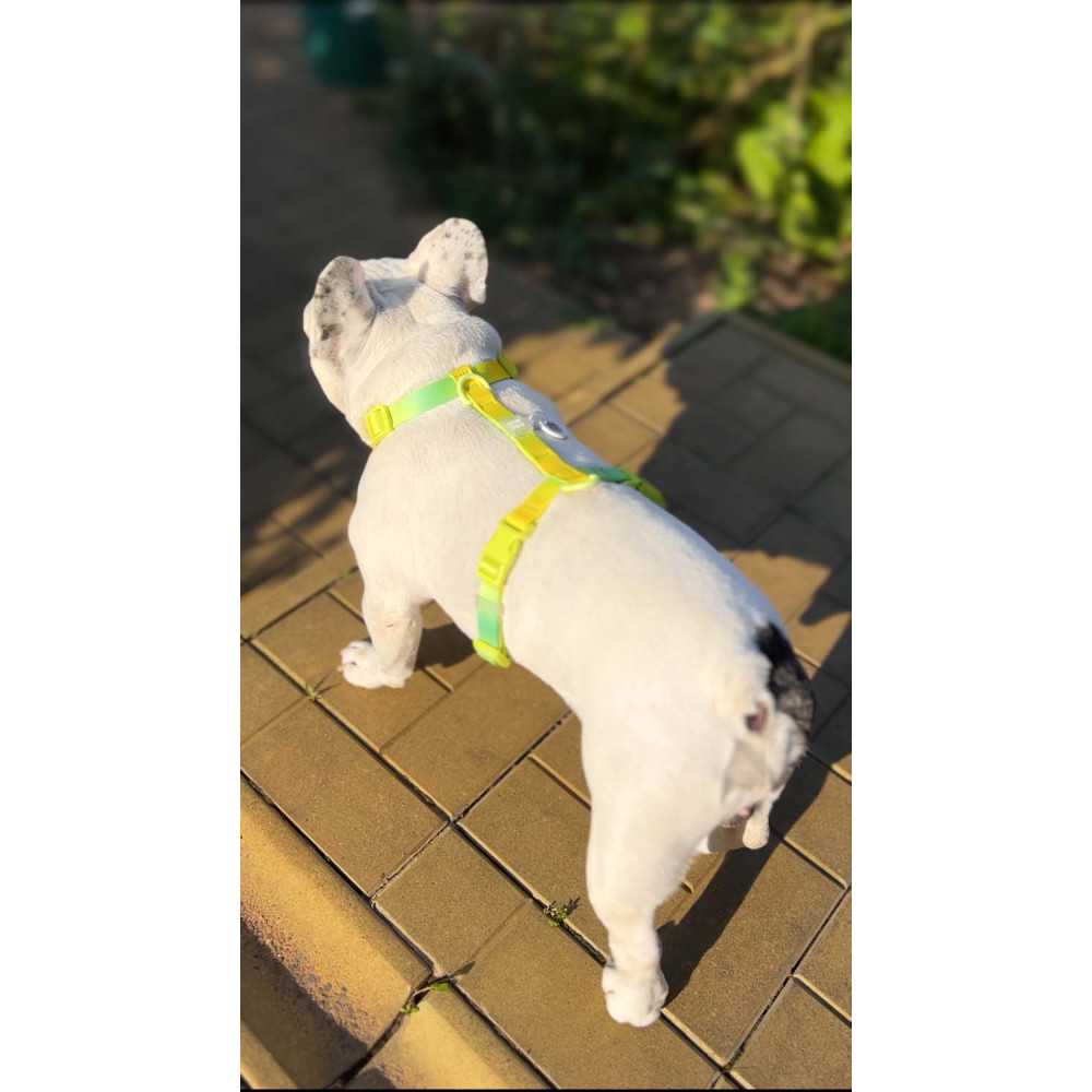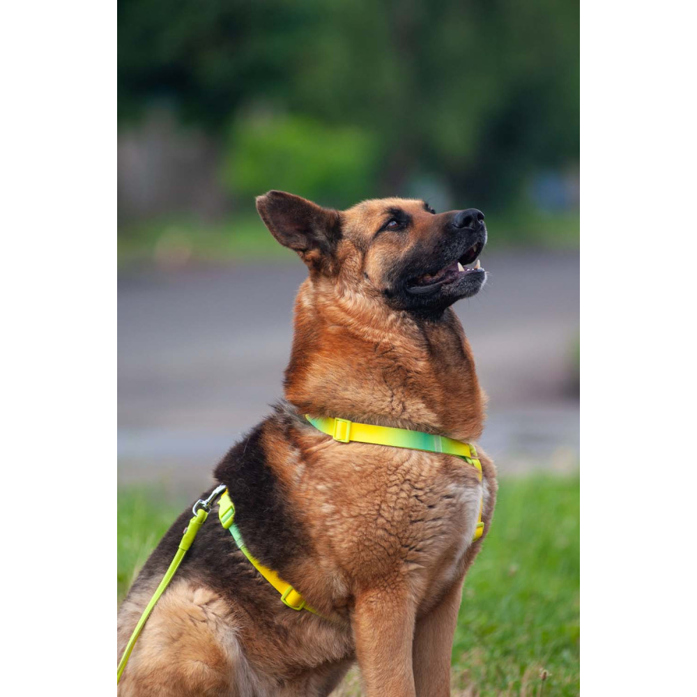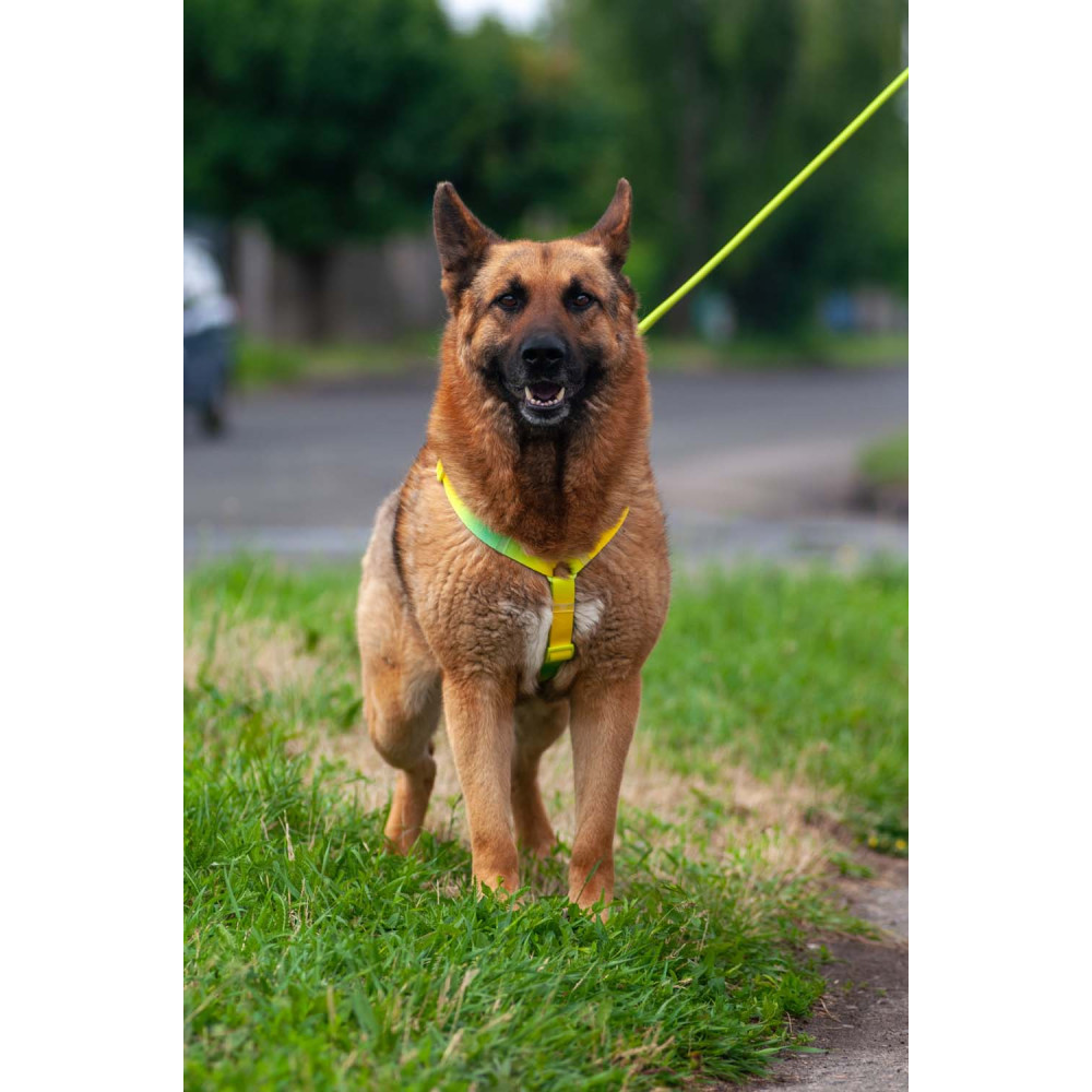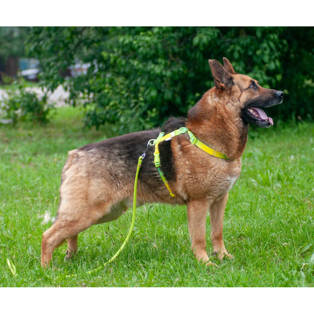 Конструктивные особенности: шлея имеет анатомически правильную Н-образную форму, которая не давит на горло и не блокирует лопатки во время бега. Прочный пластиковый фастекс надежно фиксирует амуницию и не боится влаги. Наличие 2-х колец (на спине и на груди) делает шлею универсальной для прогулок и обучения. Неоновый салатовый градиент обеспечивает отличную видимость и стильно смотрится на любой одежде для собак.