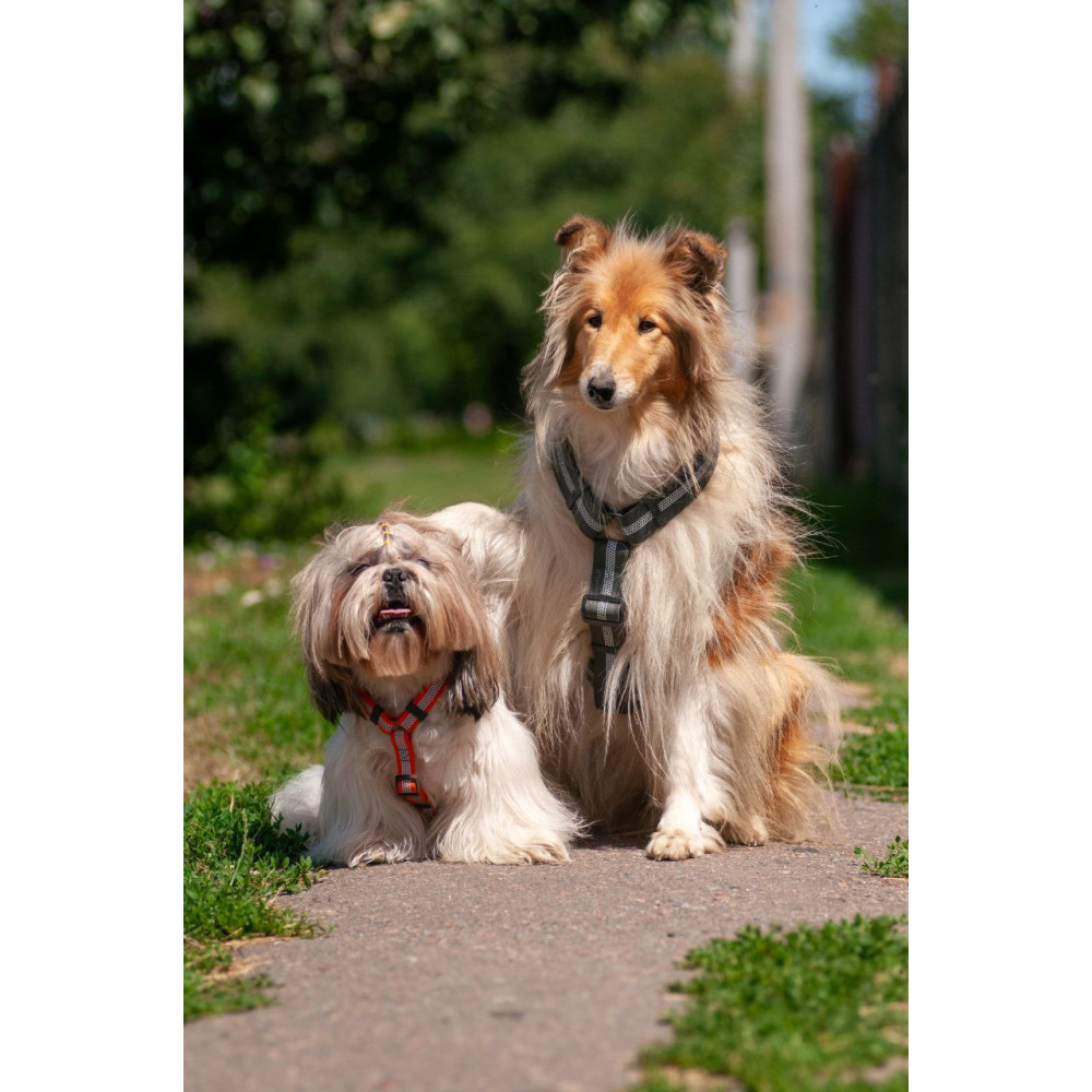 Конструктивные особенности: модель имеет анатомически правильную Н-образную форму, которая не давит на шею и оставляет свободными лопатки. Наличие 2-х колец (верхнего и нижнего) позволяет лучше контролировать собаку. Благодаря запасу регулировки, шлею легко надеть даже поверх теплой зимней одежды для собак.