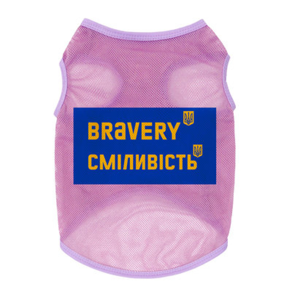 • Дизайн: розовая майка с принтом "BRAVERY / СМЕЛОСТЬ" и гербом Украины.