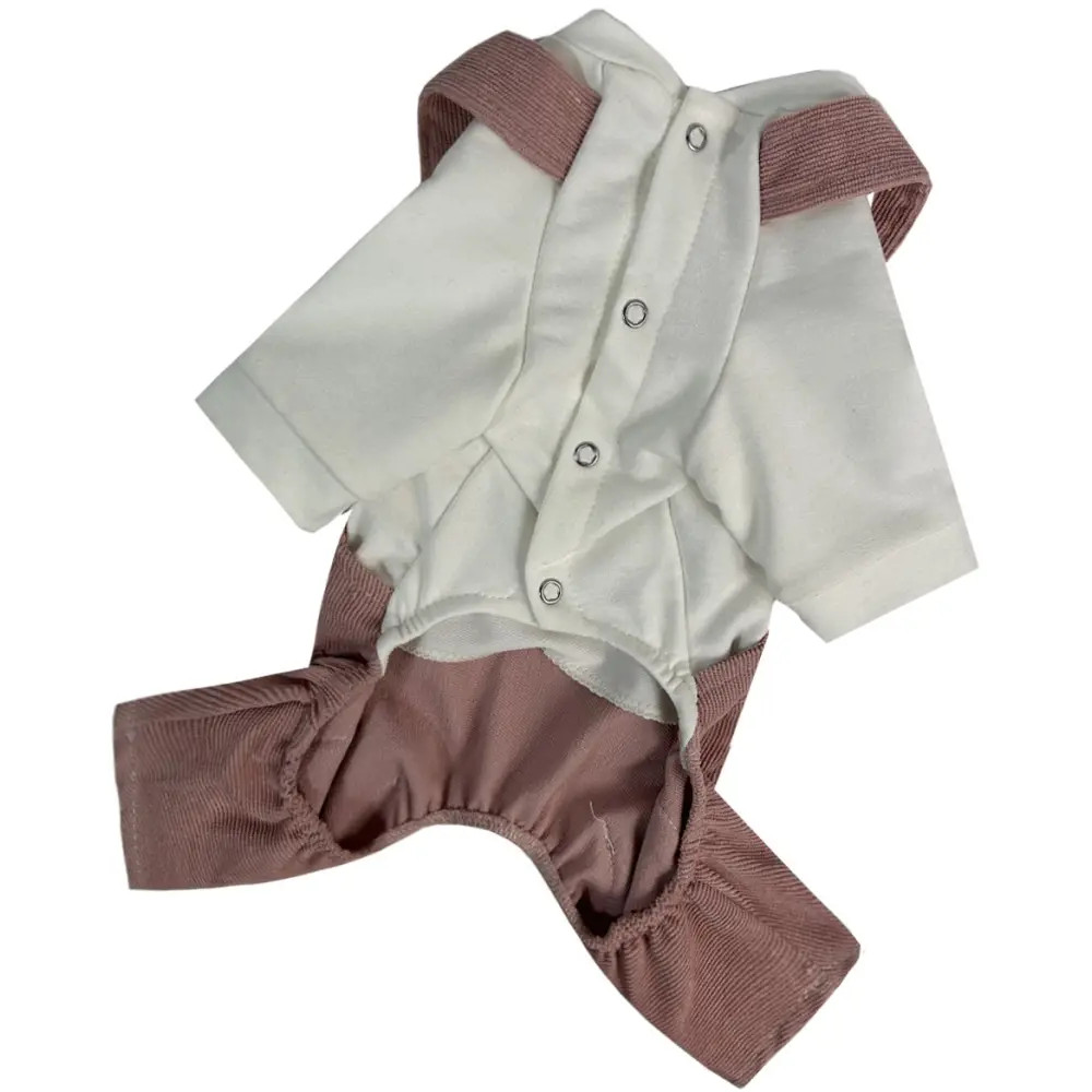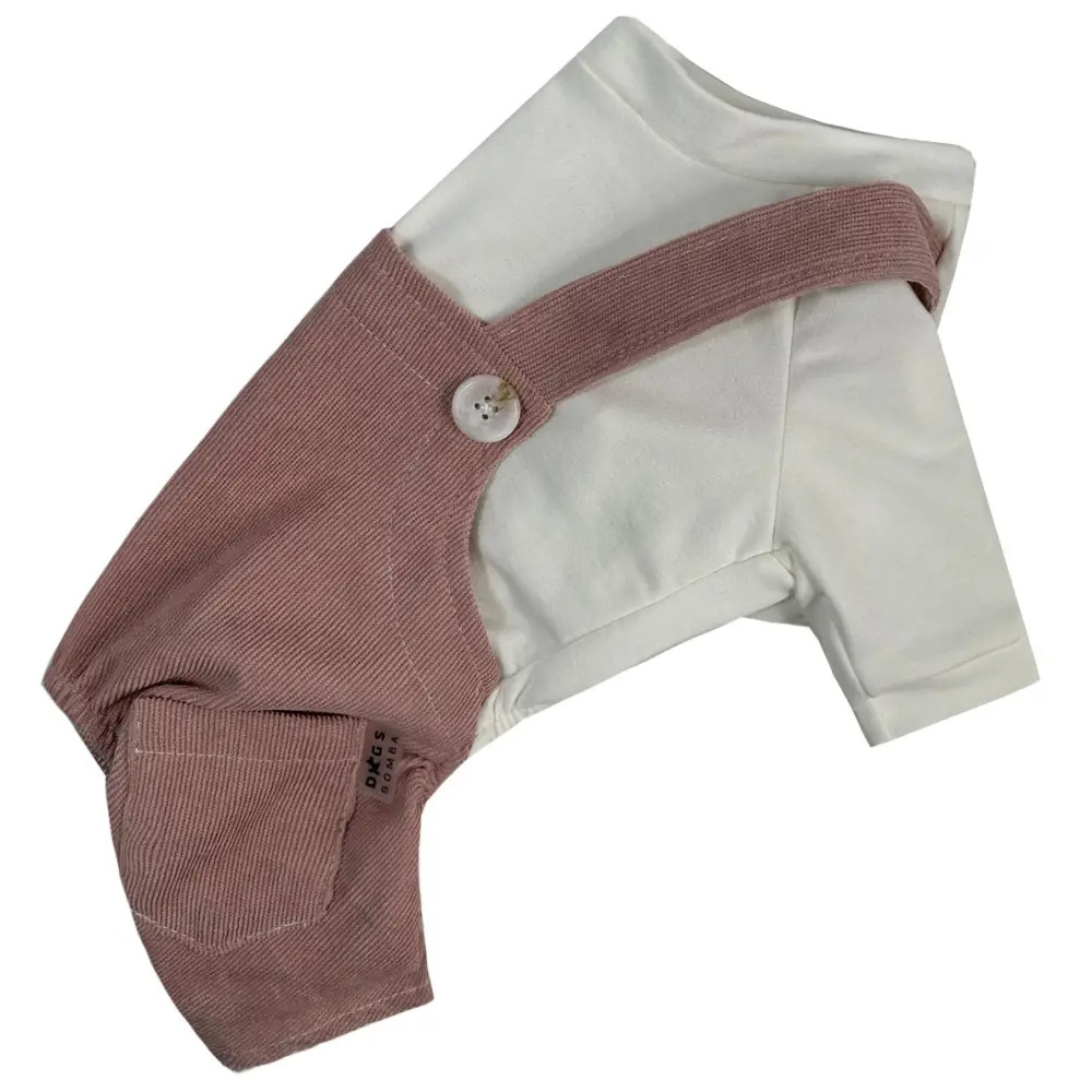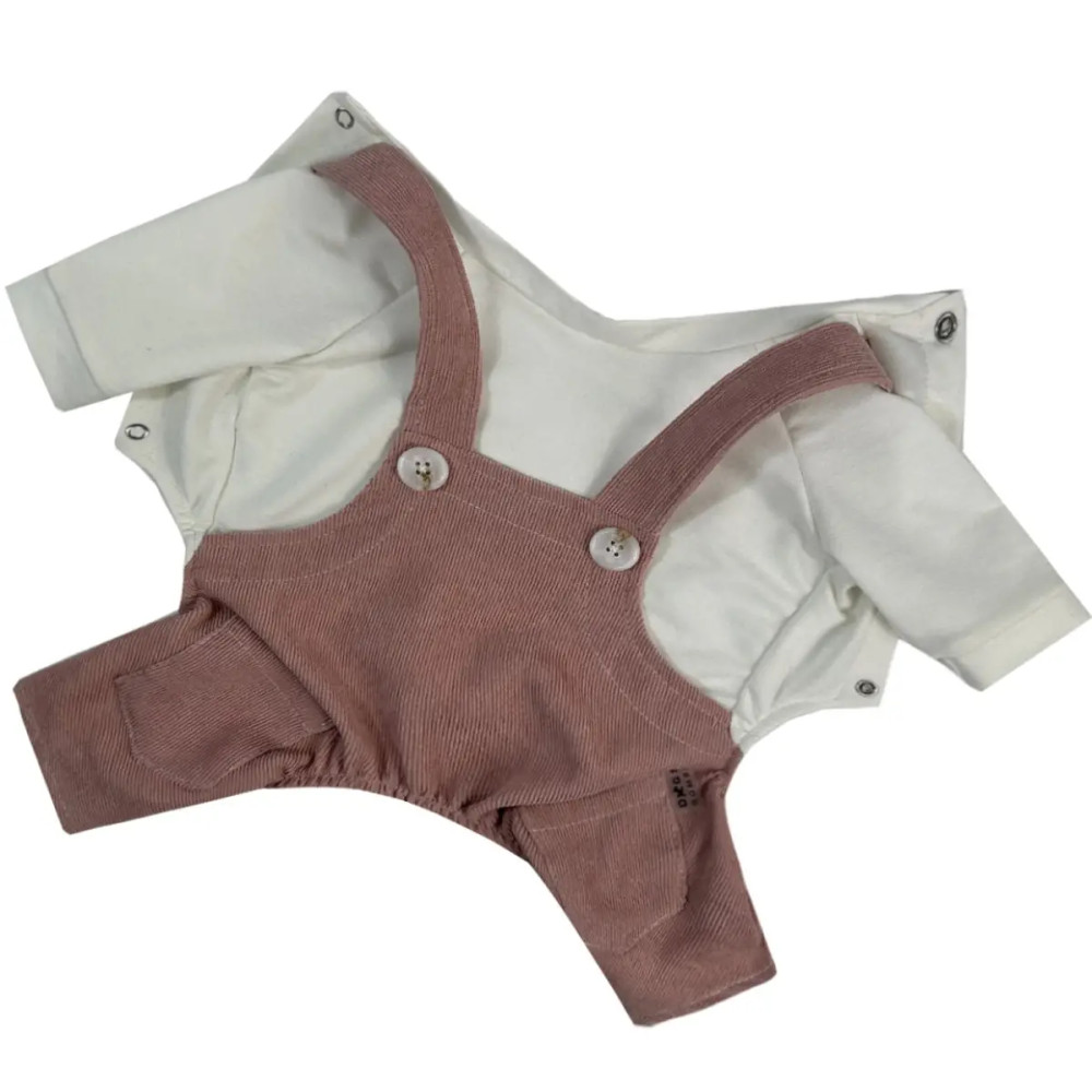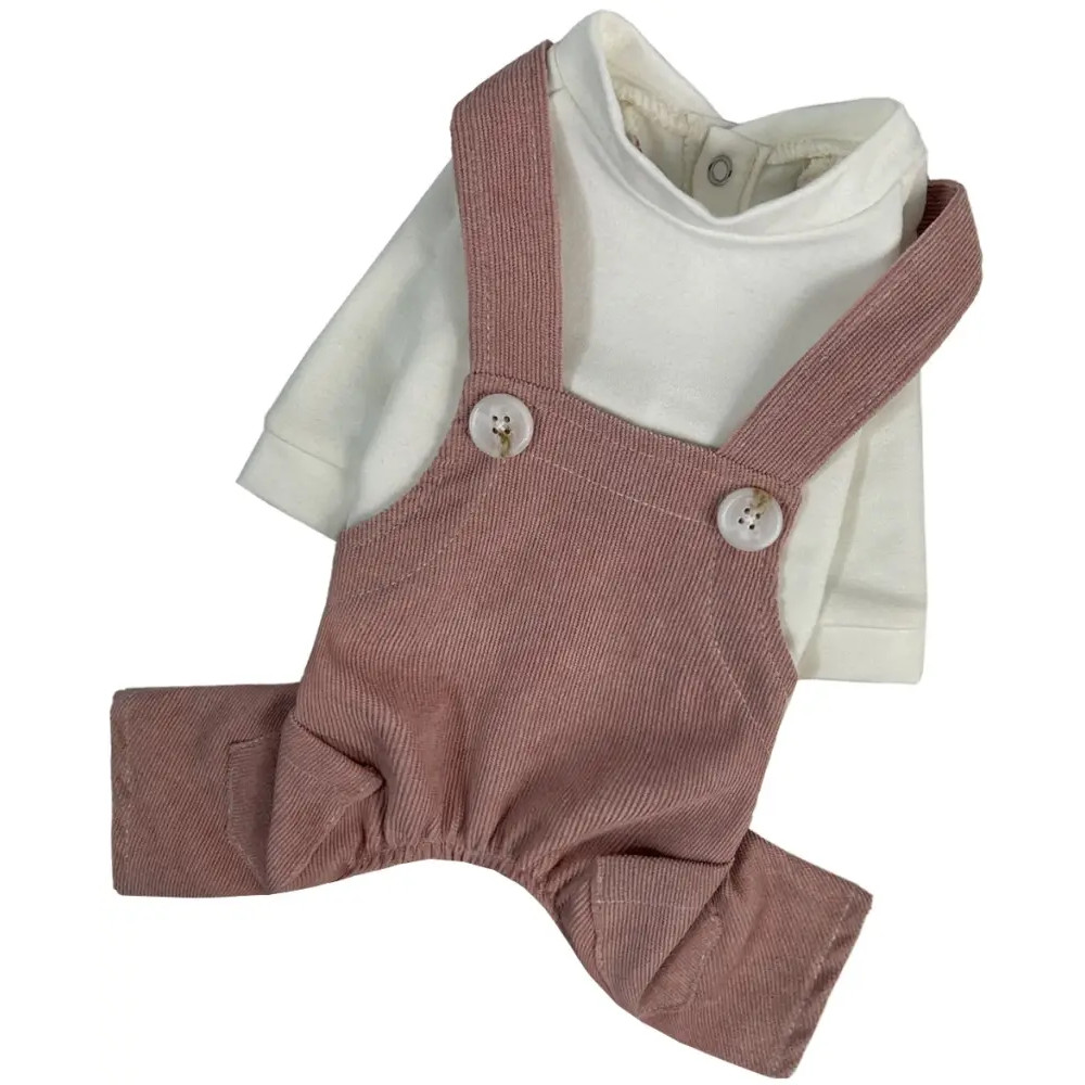 - Брючки: из лёгкого вельвета пудрового цвета с декоративными лямками.
