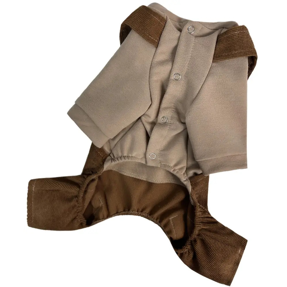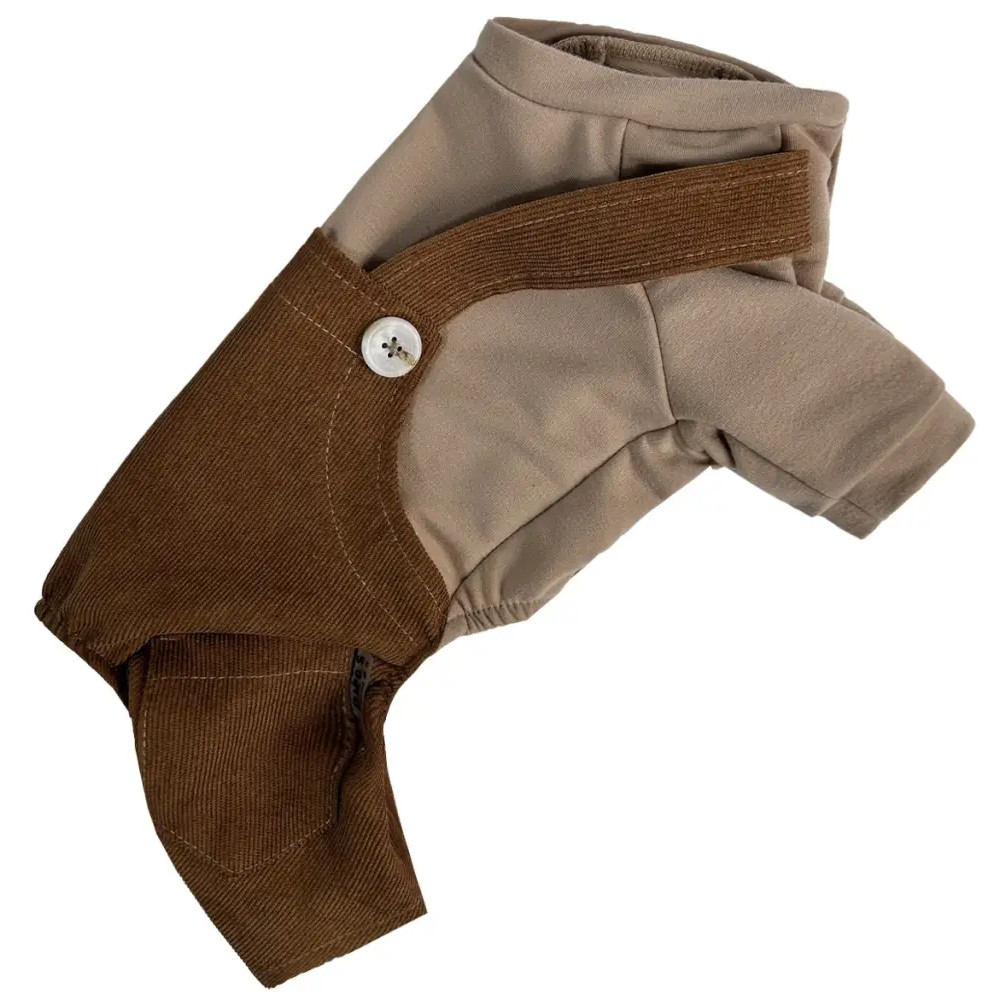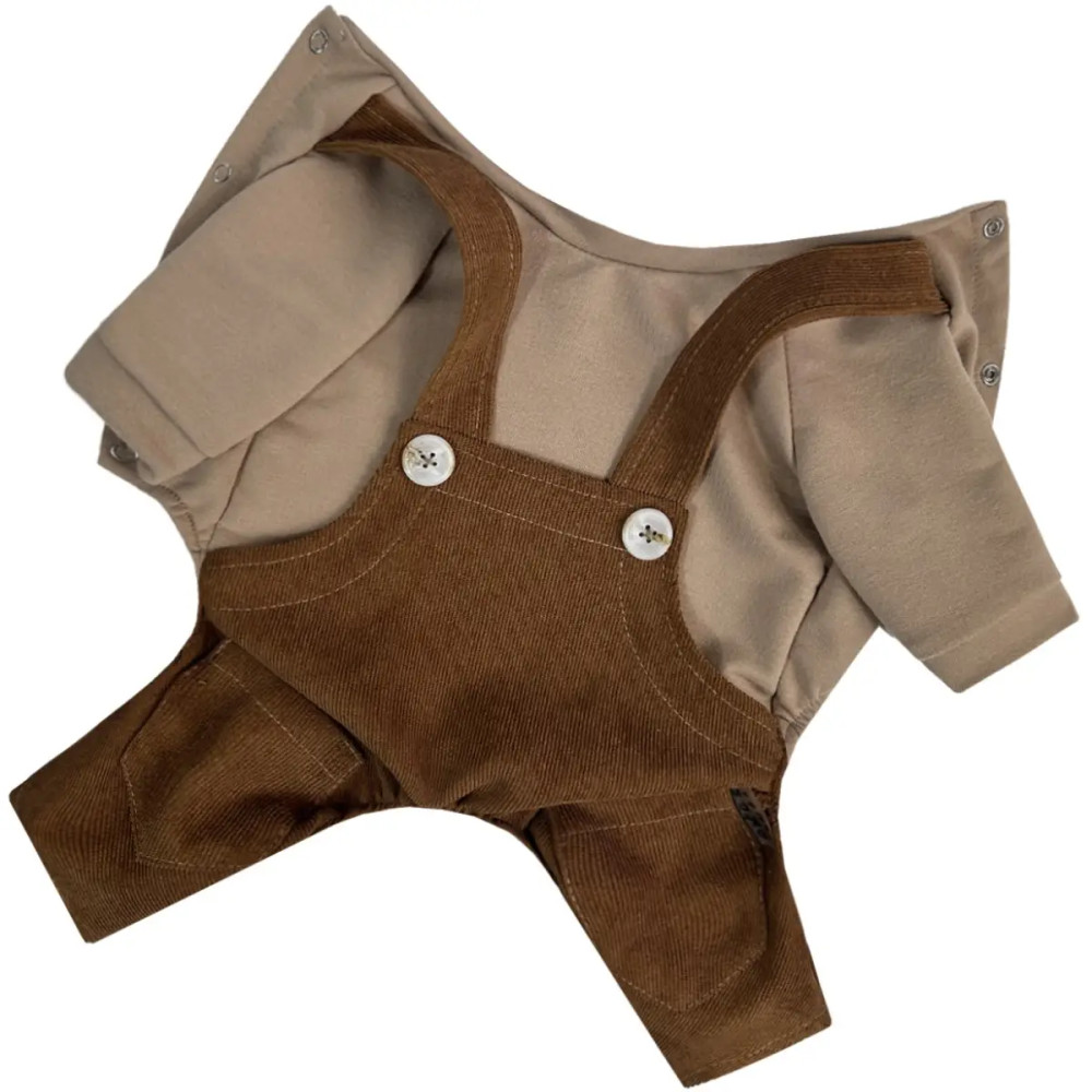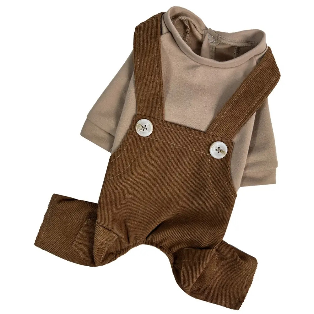 - Брючки: из вельвета шоколадного цвета, с карманами и лямками.