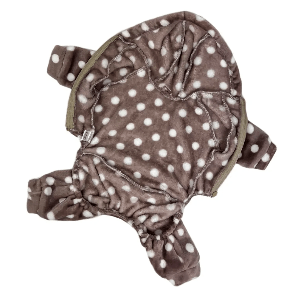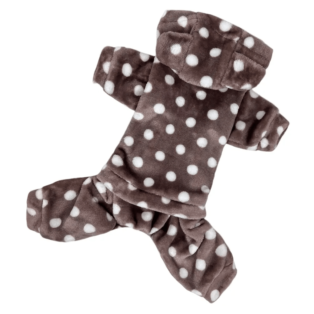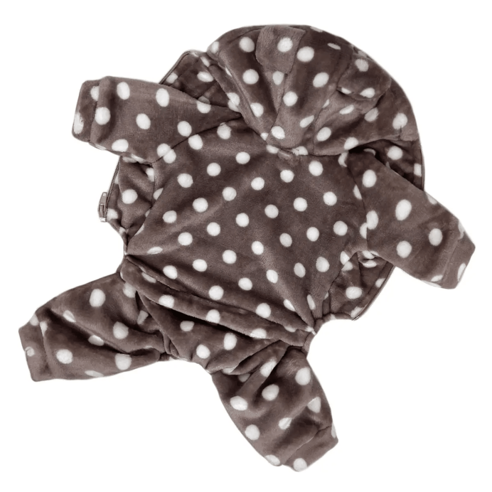 Этот костюм подходит для собак разных пород, защищая от холода на прогулках или служа уютной домашней одеждой. Принт в горошек добавляет стильный вид, делая вашего питомца особенно милым.