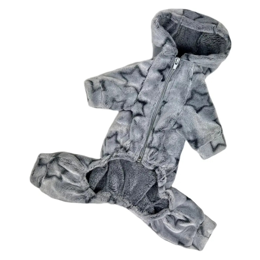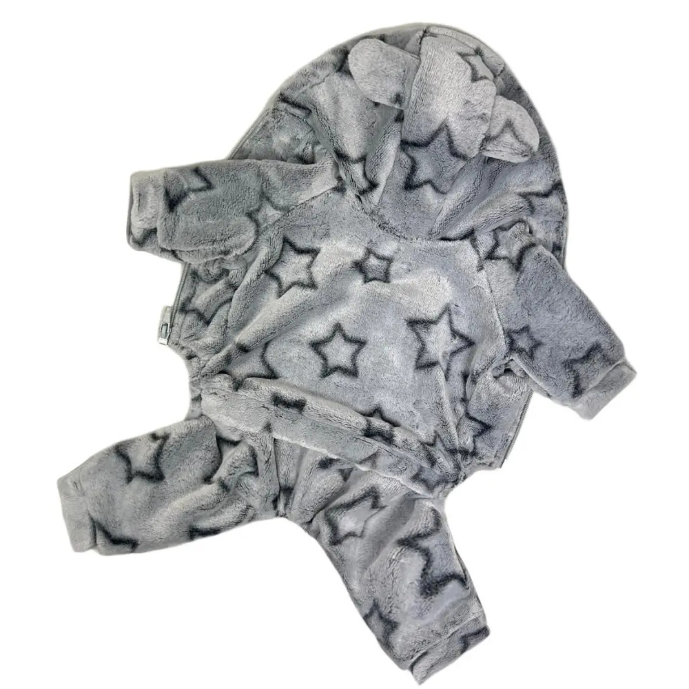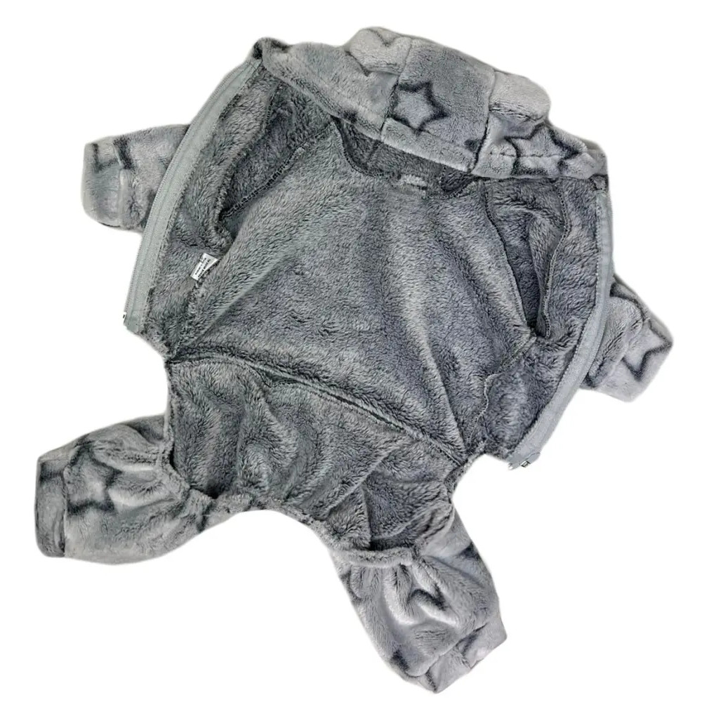 Модель утеплена, застёгивается на удобную молнию по животу, что делает процесс одевания максимально простым. Капюшон защищает от ветра и придаёт образу забавный вид. Серый дизайн с ярким узором «звёзды» выделяет питомца среди других собак.
