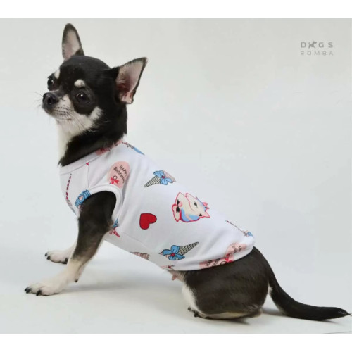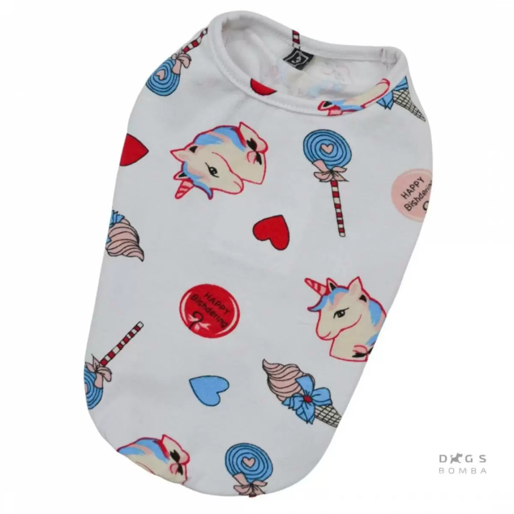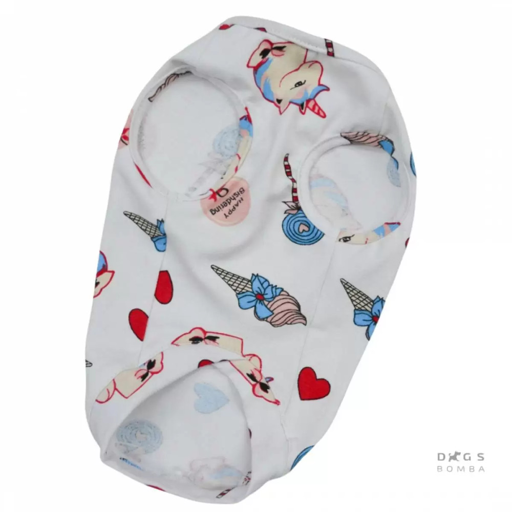 Белая майка для собак Dogs Bomba F-26 с милым принтом «Единорог» — это must-have для летнего гардероба вашего питомца. Изделие не только придает стильный вид, но и выполняет важную гигиеническую функцию, защищая шерсть от городской пыли и репьев.