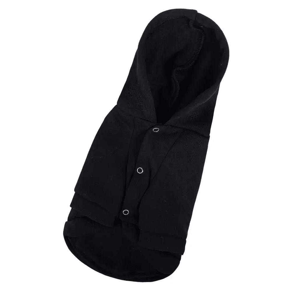 Толстовка для собак Dogs Bomba Y-309 выполнена из прочной трехниточной ткани с начесом, обеспечивающей надежную защиту от холода и ветра. Модель черного цвета застегивается на удобные кнопки на животе, что облегчает надевание. Изделие дополнено капюшоном, который закрывает шею питомца, сохраняя тепло во время прогулок.