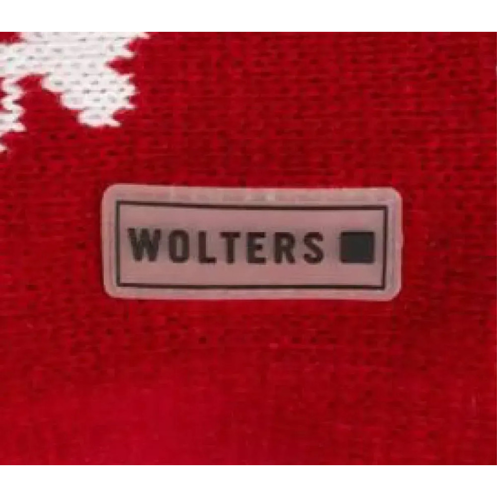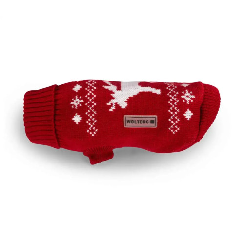 Wolters Rudi — красный вязаный свитер для собак на холодный сезон. Мягкий 100% полиэстер удерживает тепло, высокий ворот плотно прикрывает шею, праздничный олень выделяет питомца на прогулке и на фото.
