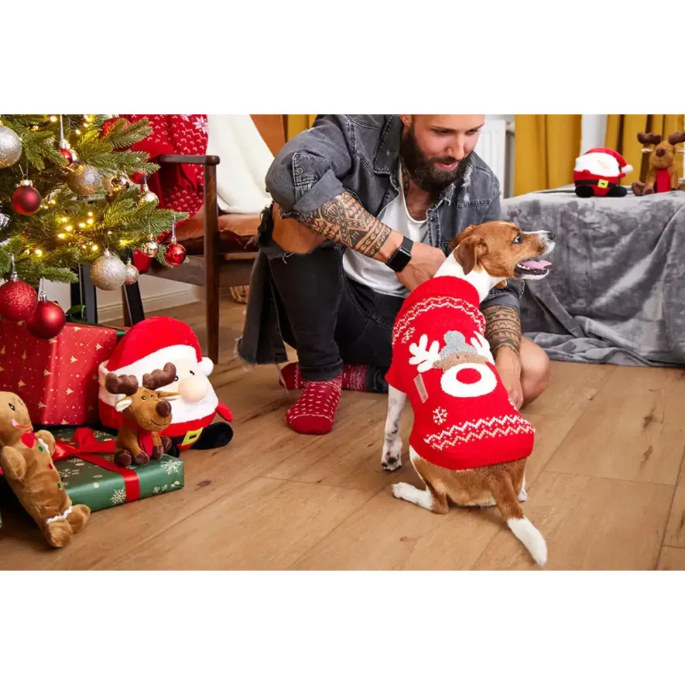 Wolters Rudi — вязаный свитер для собак в ярко-красном цвете с праздничным мотивом оленя. Мягкий трикотаж сохраняет тепло, высокий ворот защищает шею, эластичная вязка не стесняет движения на прогулке и дома.