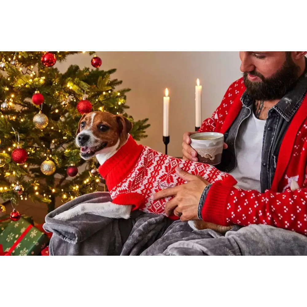 Wolters Thore — вязаный свитер для собак в красном цвете с норвежским узором. Высокий ворот защищает шею, эластичная вязка мягко облегает корпус и не стесняет движения, ребристые манжеты удерживают тепло. Подходит для прогулок в прохладную погоду и как альтернатива лёгкой куртке.