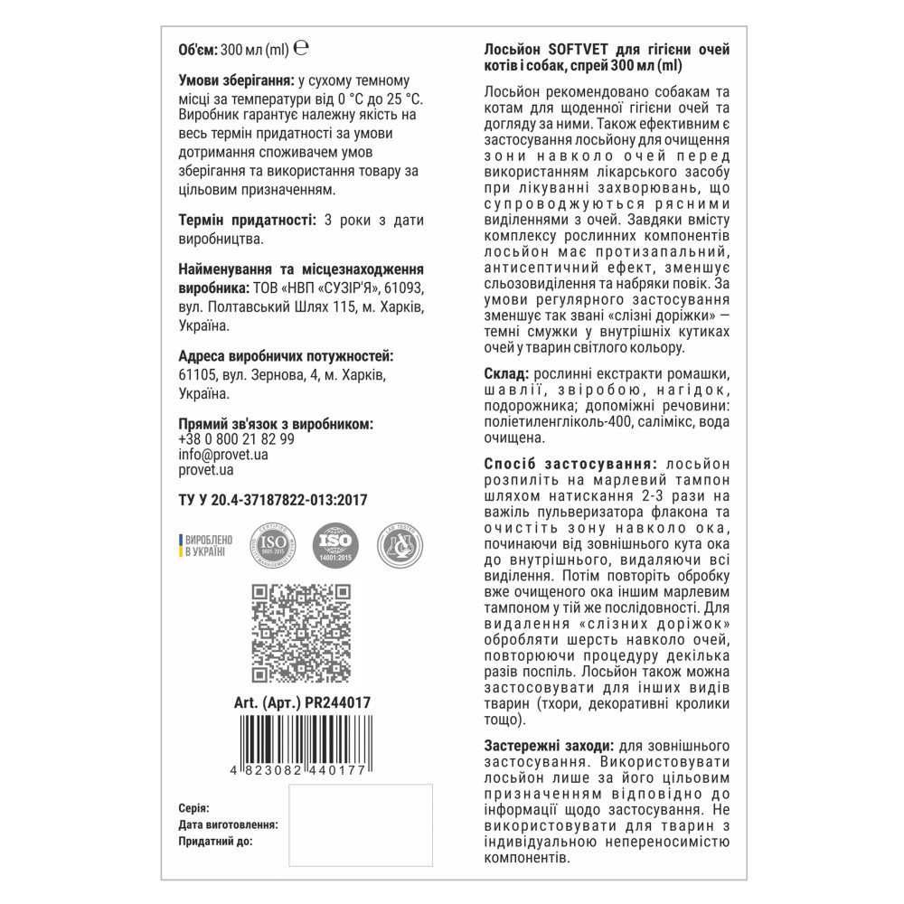 Лосьон Provet SOFTVET — это специализированное средство на основе растительных экстрактов для бережного ухода за глазами собак и кошек. Предназначен для ежедневной гигиены, удаления загрязнений и подготовки зоны вокруг глаз к применению ветеринарных препаратов.