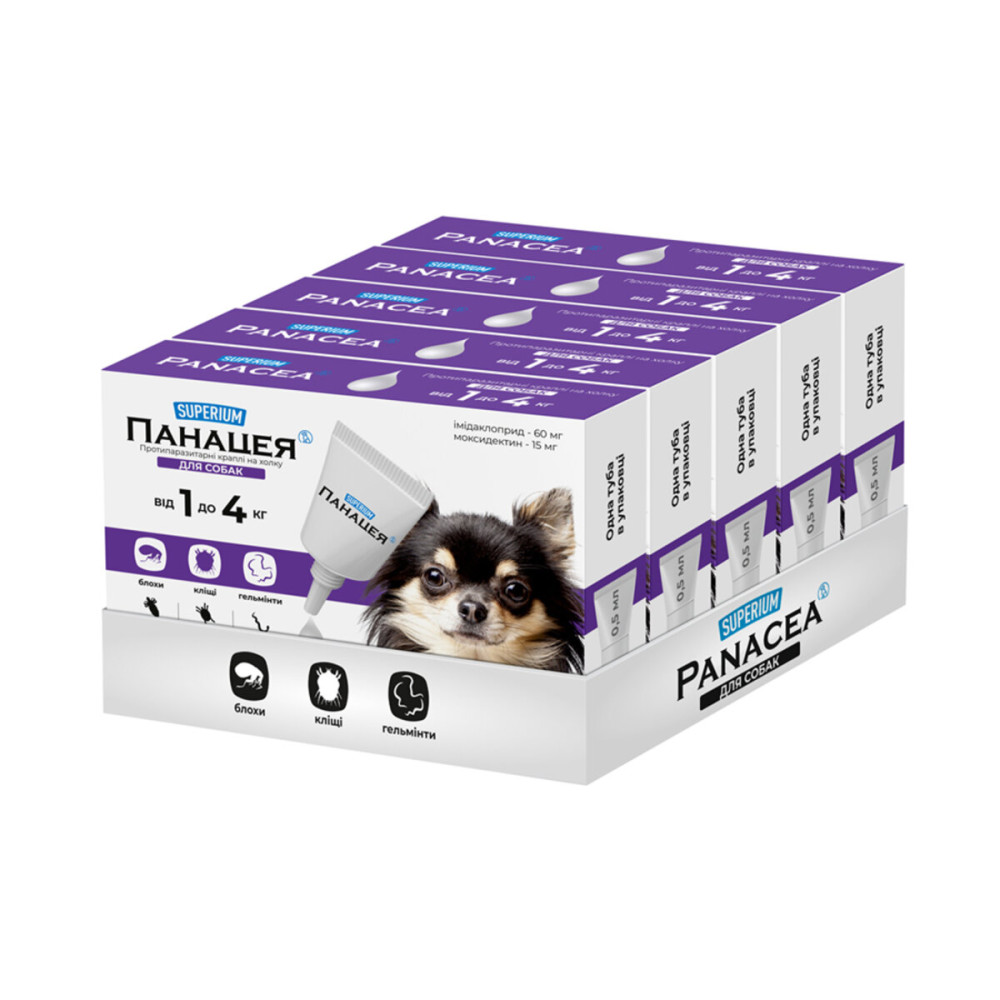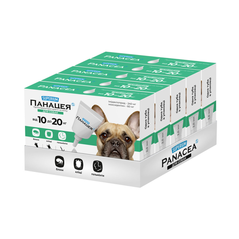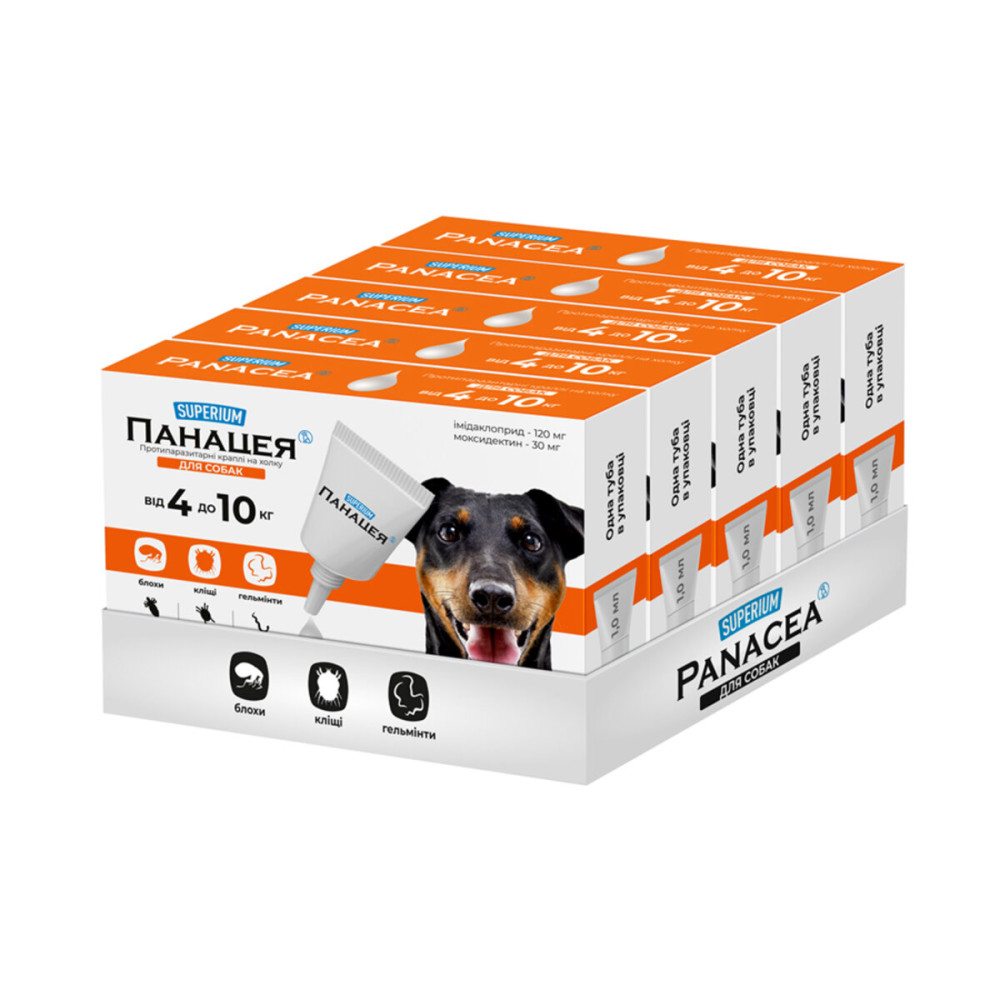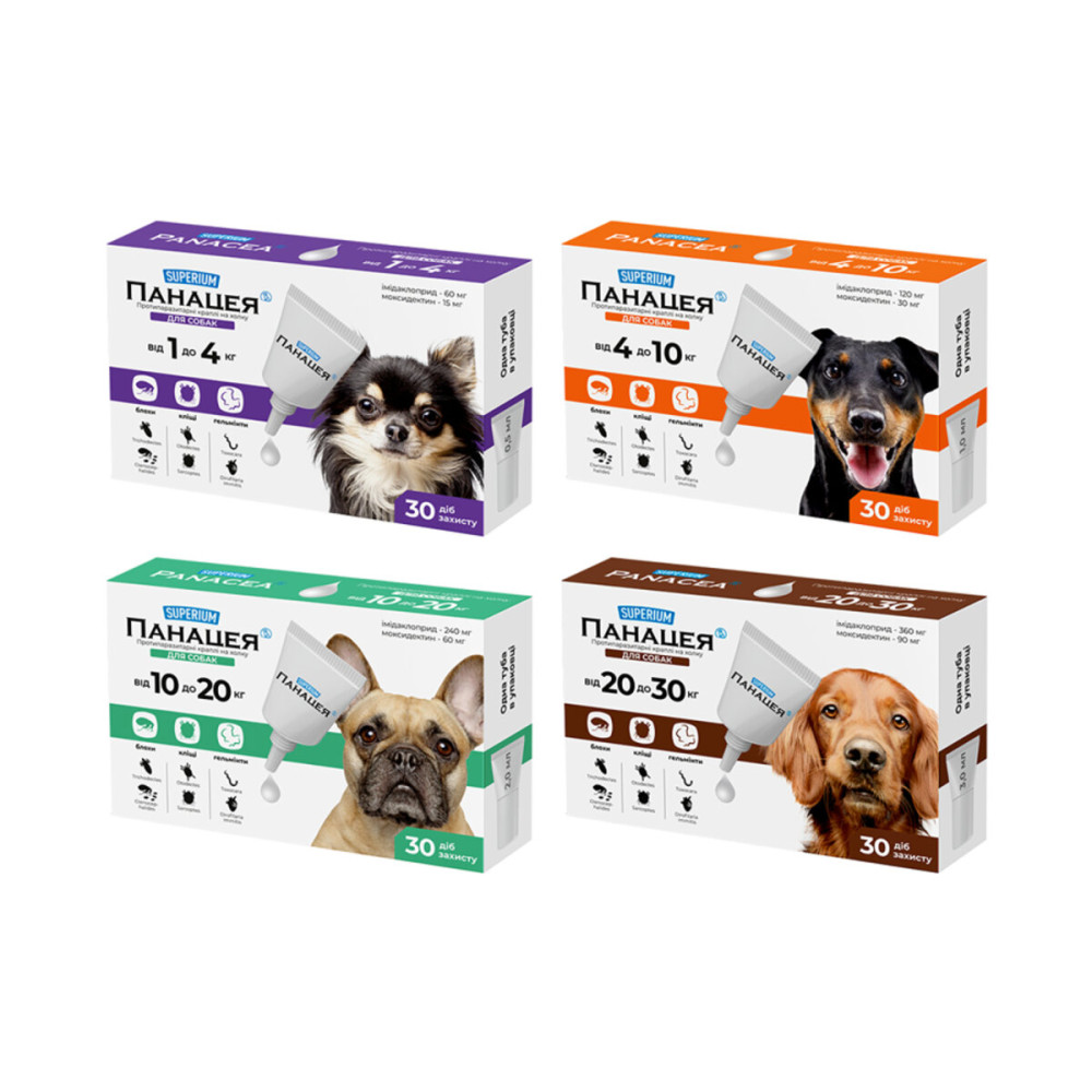 Противопаразитарные капли для собак SUPERIUM Панацея обеспечивают надежную защиту вашего любимца от широкого спектра паразитов в течение 30 суток. Эффективны для лечения и профилактики при поражении клещами, блохами, вшами, власоедами и гельминтами (нематодами).