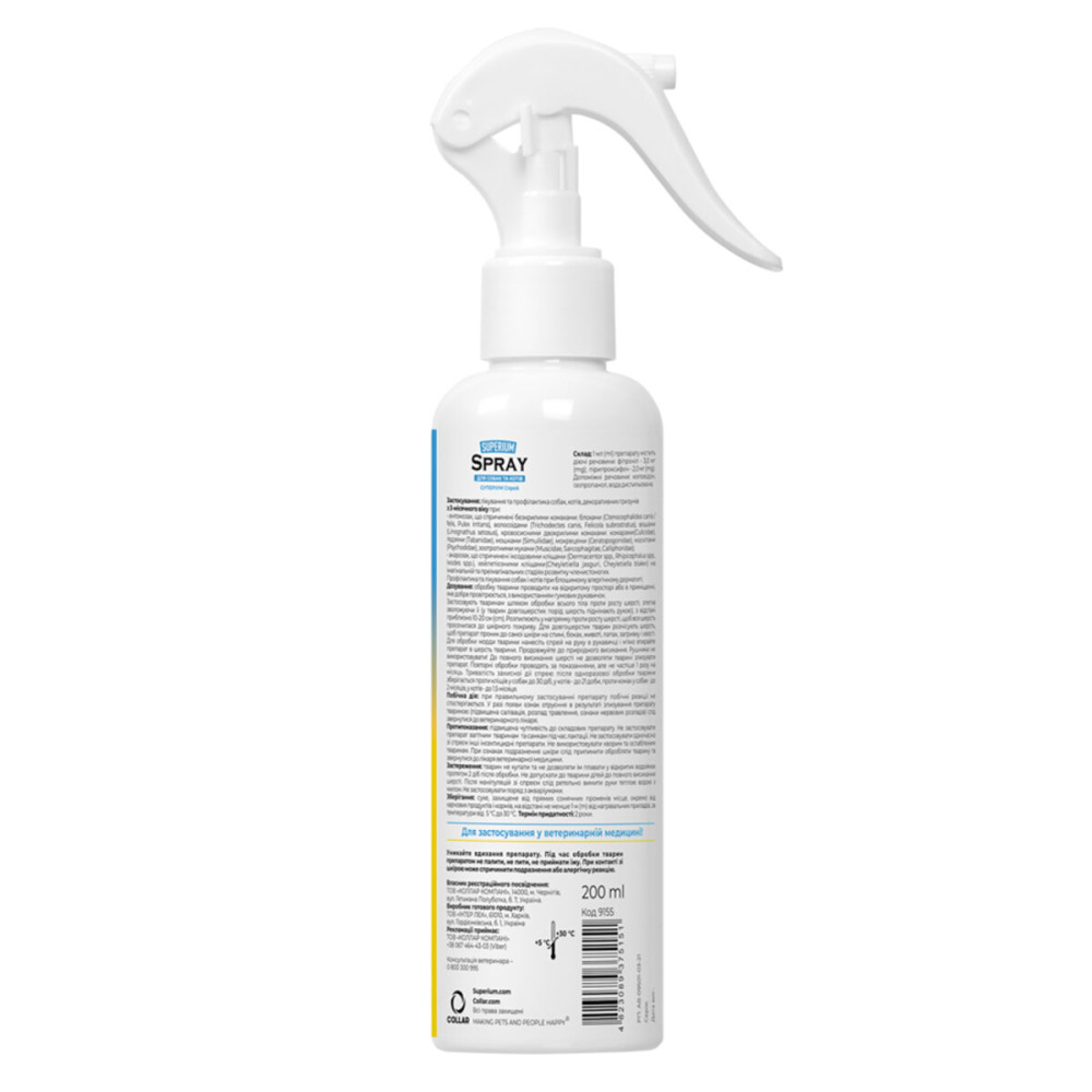 Спрей SUPERIUM обеспечивает комплексную защиту, уничтожая эктопаразитов, отпугивая насекомых и леча аллергические реакции. Благодаря активным компонентам, средство начинает действовать сразу после нанесения.