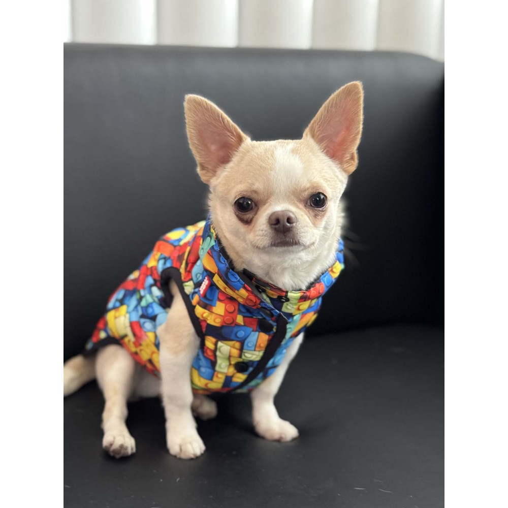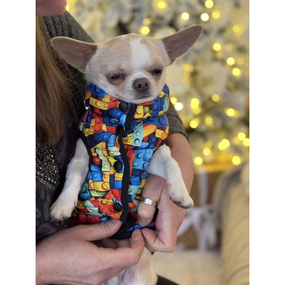 Мультисезонная модель выполнена из высококачественного материала, который защищает от ветра и прохлады. Двойной ряд кнопок позволяет точно подогнать размер, гарантируя удобную посадку. Яркий принт "Блоки Лего" добавляет оригинальности, подчёркивая уникальный стиль вашего питомца.