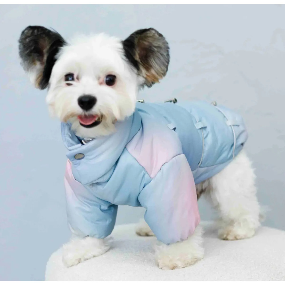 Куртка с фиксаторами для собак тай-дай голубого цвета K-83 — это тёплая и удобная одежда для прогулок в холодную и дождливую погоду. Выполнена из водоотталкивающей плащёвки с подкладкой и утеплителем синтепоном, что обеспечивает комфорт и защиту.