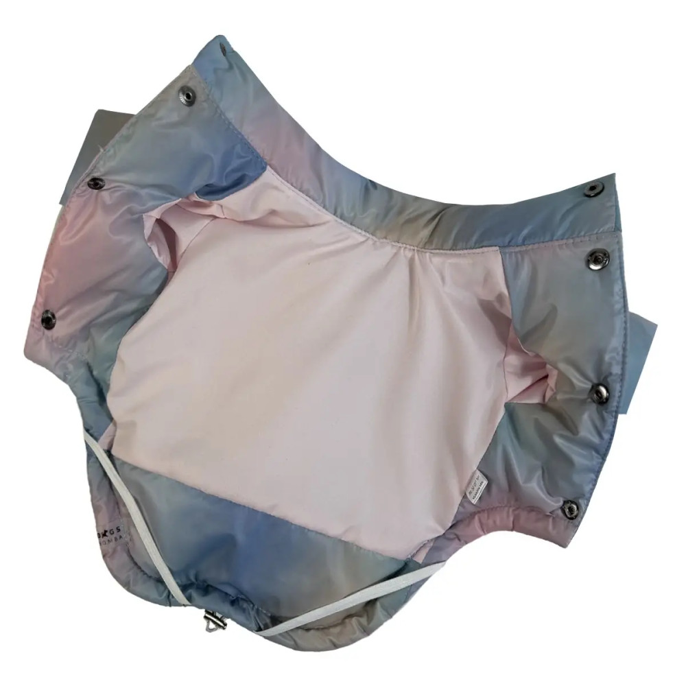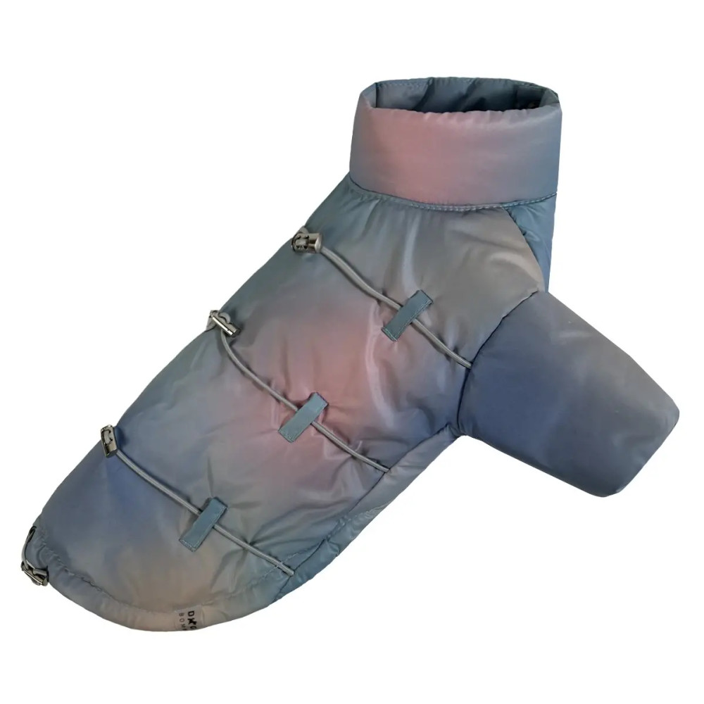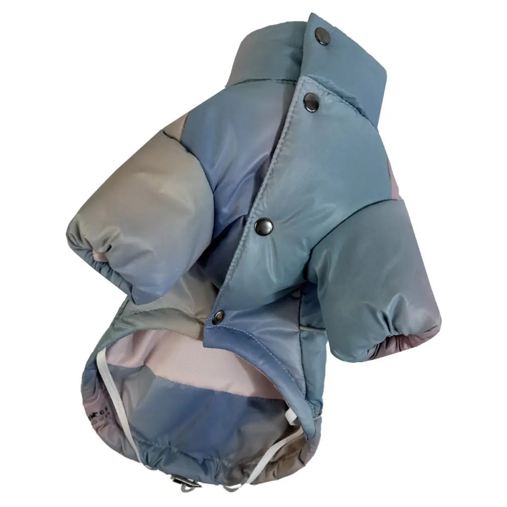 Модель застёгивается на кнопки на груди и оснащена регуляторами обхвата и длины, позволяя идеально подогнать куртку под собаку. Стильный голубой тай-дай оттенок добавляет образу оригинальности и яркости.