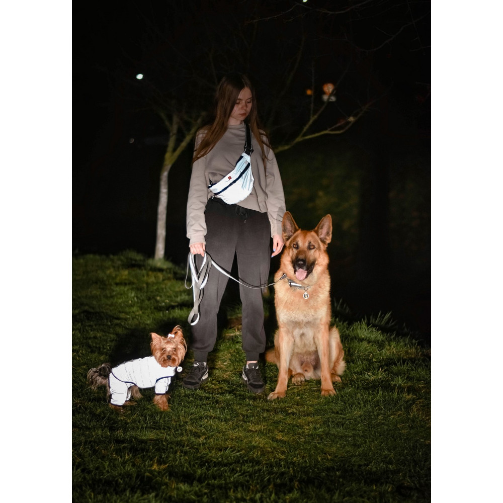 - Функции: светоотражающие элементы по периметру значительно повышают видимость собаки в тёмное время суток.