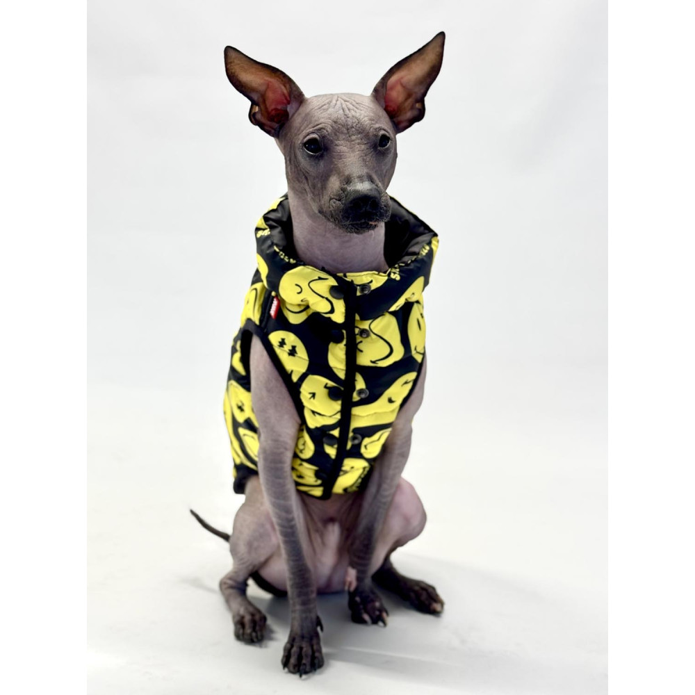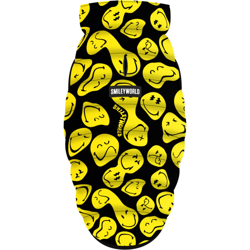 Двойной ряд кнопок позволяет легко регулировать размер и обеспечивает идеальную посадку на собак различных пород и комплекций. Оригинальный дизайн с рисунком «Смайлы на черном» делает курточку яркой, заметной и стильной, что выделяет вашего питомца на прогулке.