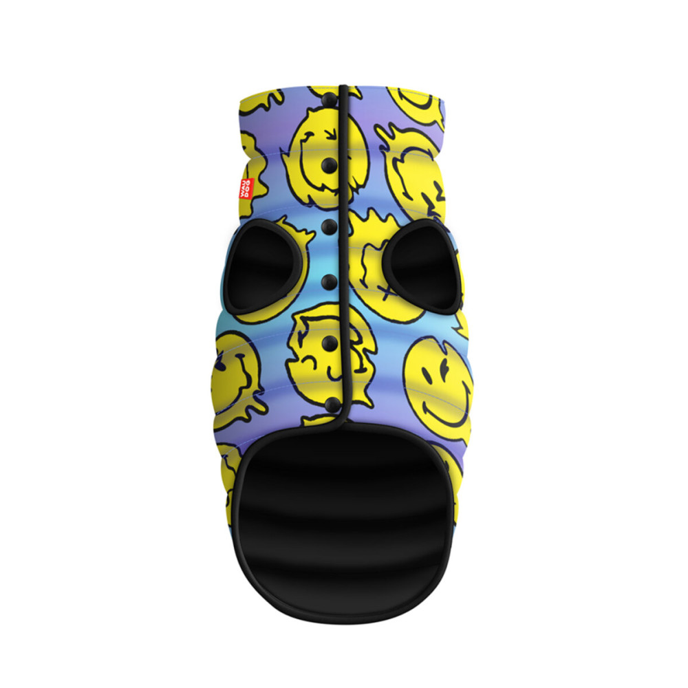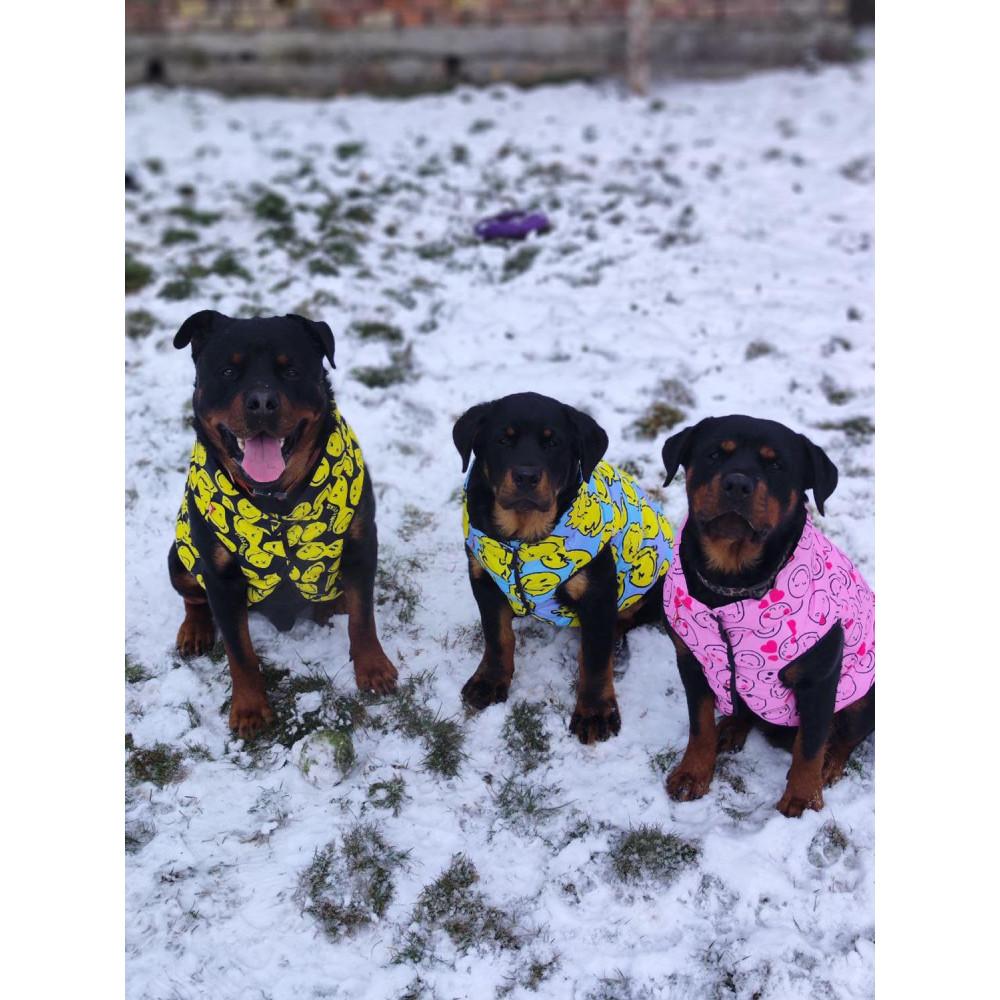 Двойной ряд кнопок позволяет регулировать размер, обеспечивая удобную посадку на собак разных пород и размеров. Весёлый и оригинальный принт «Смайлы на голубом» улучшает настроение и привлекает внимание к вашему питомцу.