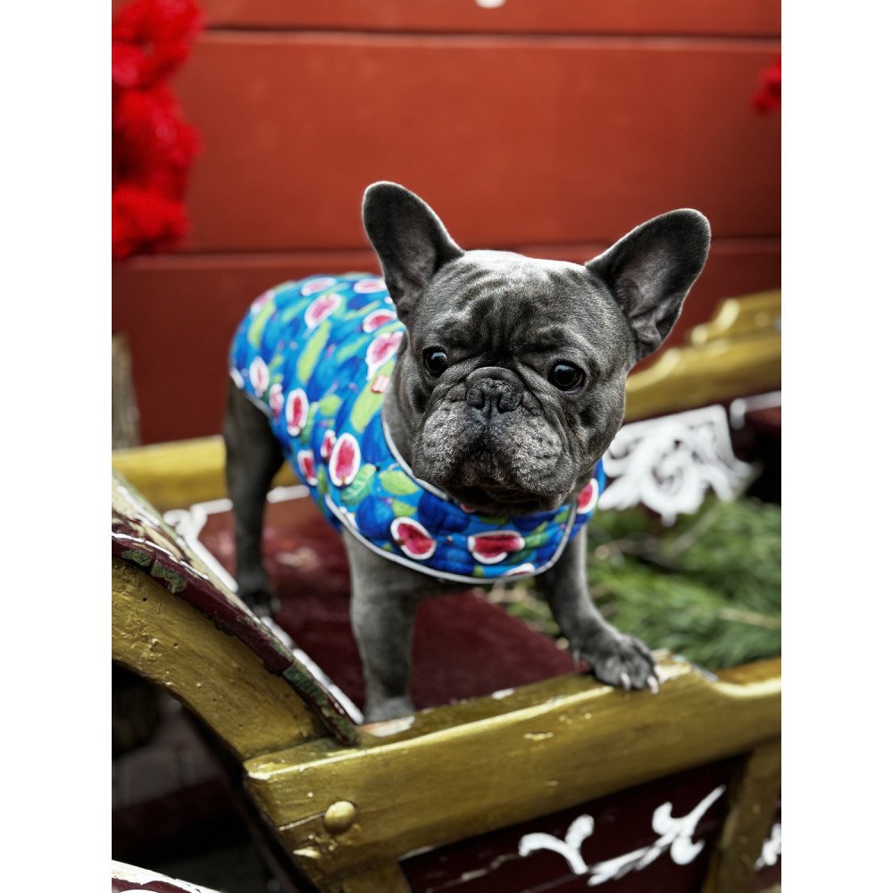 Модель легко надевается благодаря застёжке-липучке, имеет отверстие для шлейки и эффектный принт с инжиром, который добавит оригинальности образу питомца.