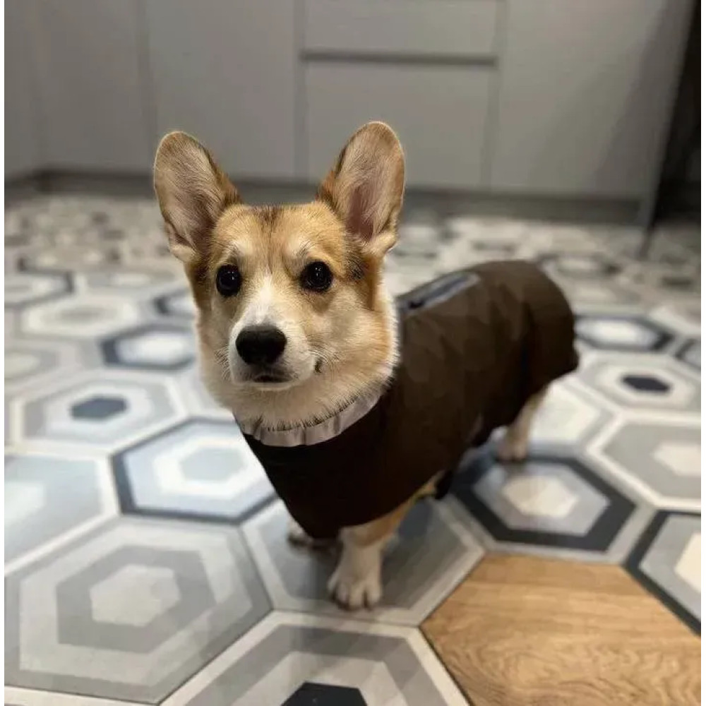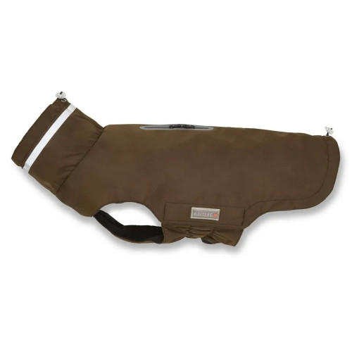 Wolters Modern Classic — попона-дождевик для собак в коричневом цвете на холодную и влажную погоду. Верх с ecorepel® отталкивает воду и грязь, защита до 10 000 мм, конструкция дышит и держит ветер. Внутри — мягкий флис. Широкий ворот закрывает шею, герметичная молния Zip&Go препятствует протечкам. На шее — светоотражающая полоса для видимости в сумерках.