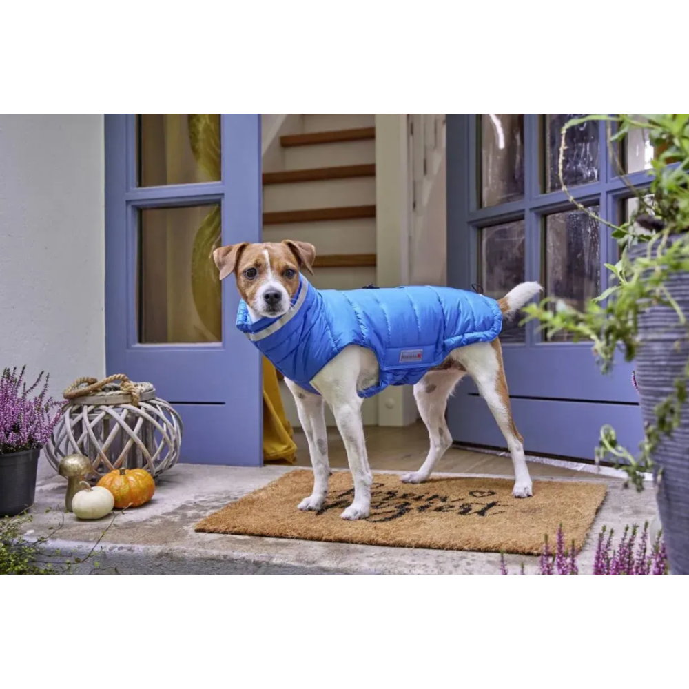 Wolters Cosy — тёплая стёганая куртка для собак в синем цвете на холодный сезон. Полиэстеровый верх легко очищается, выдерживает до 3 000 мм водяного столба и имеет экологичную пропитку Teflon EcoElite™, отталкивающую воду и грязь. Внутри — согревающая полиэстеровая вата без материалов животного происхождения. Модель PFC-free, ветрозащитная и «дышащая».