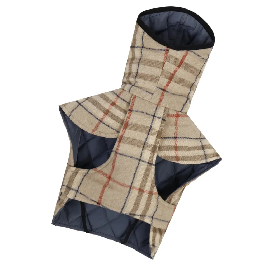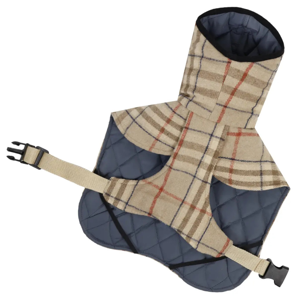Снаружи изделие выполнено из влагозащитной плащёвки, а внутри — из мягкой клетчатой фланели. Утеплитель синтепон сохраняет тепло в холодное время года. Капюшон-трансформер можно носить как высокий воротник или полноценный капюшон. Регулируемый пояс обеспечивает комфортную посадку. На шее есть отверстие для поводка.