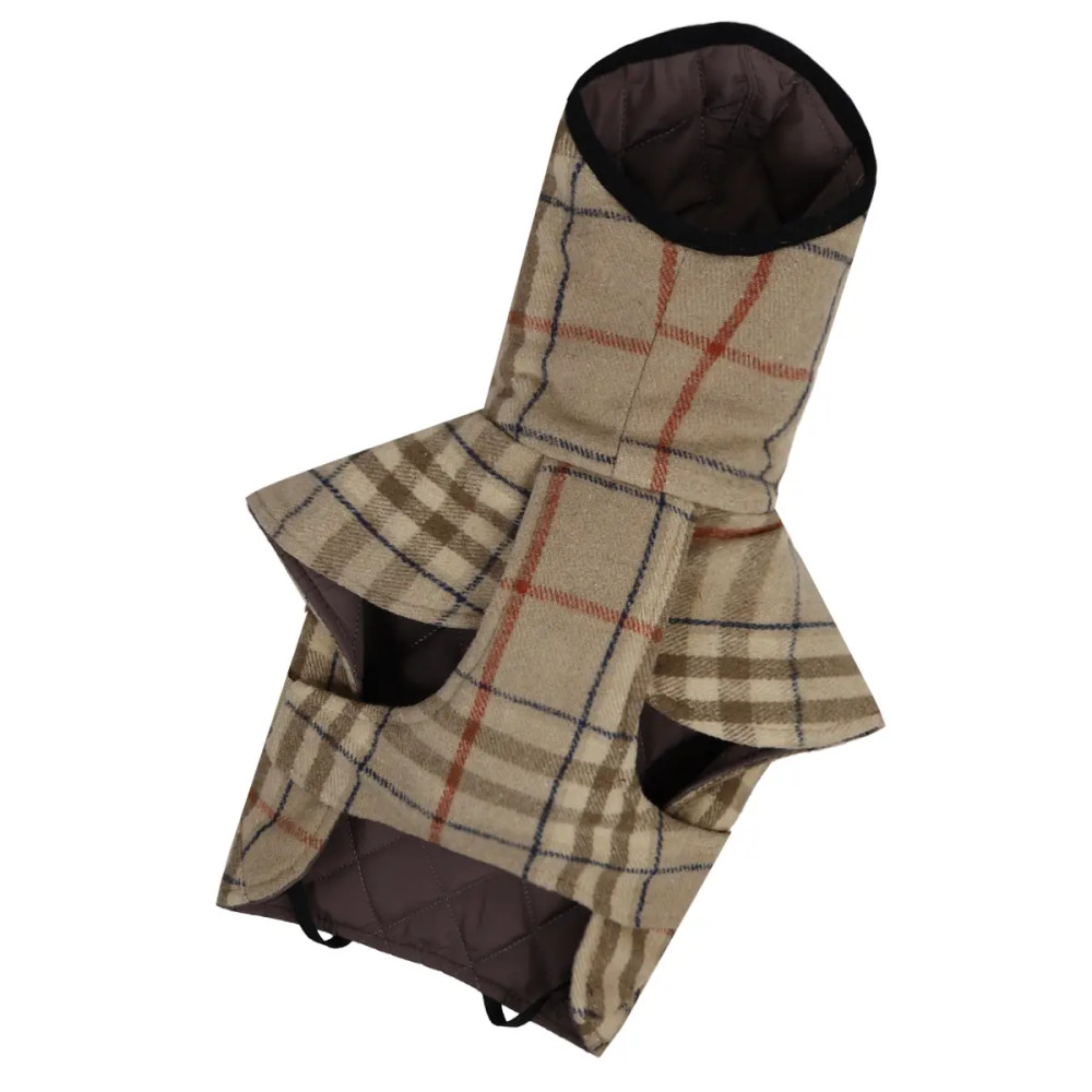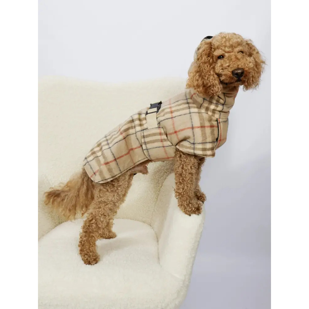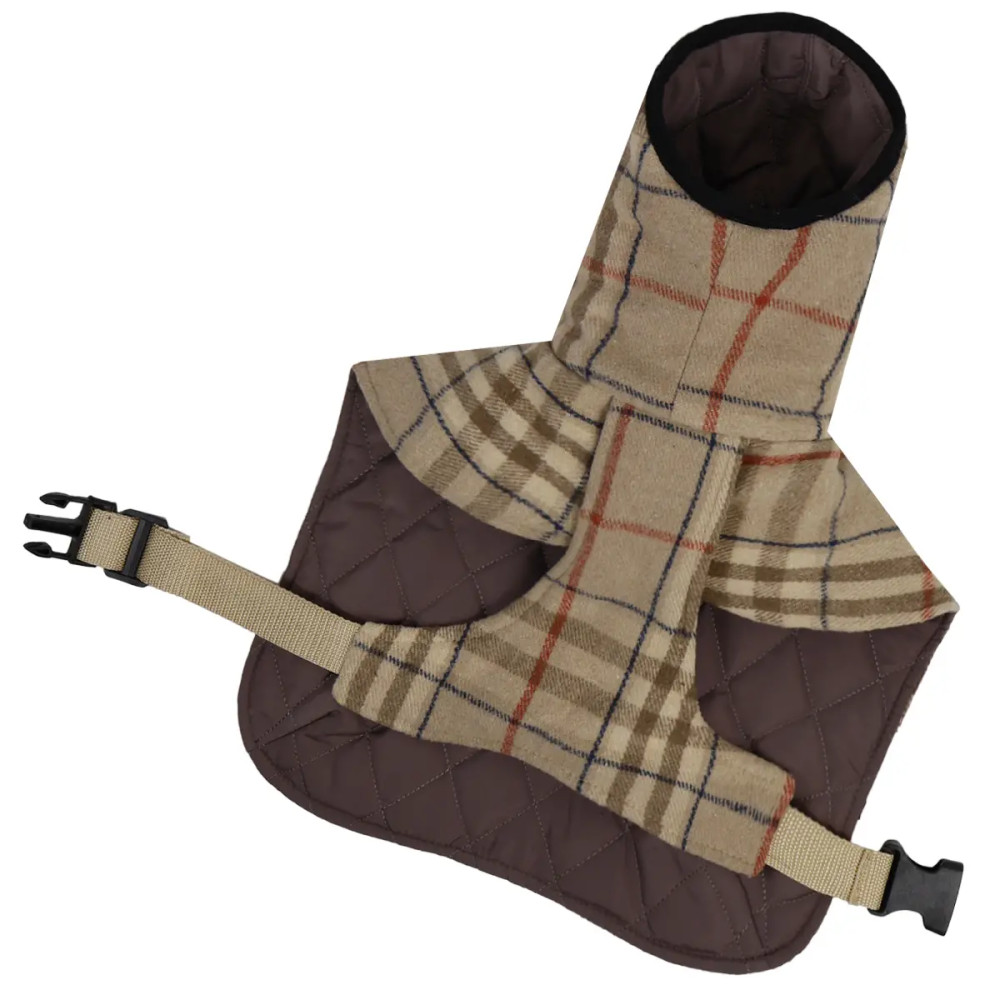 Снаружи изделие выполнено из влагозащитной плащёвки, внутри — из мягкой клетчатой фланели. Утеплитель синтепон сохраняет тепло, а капюшон-трансформер можно носить как высокий воротник или полноценный капюшон. Регулируемый пояс обеспечивает удобную посадку. На шее предусмотрено отверстие для поводка, что делает прогулки ещё комфортнее.