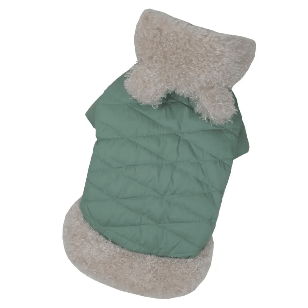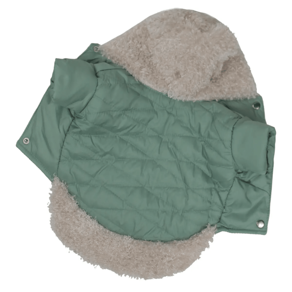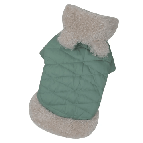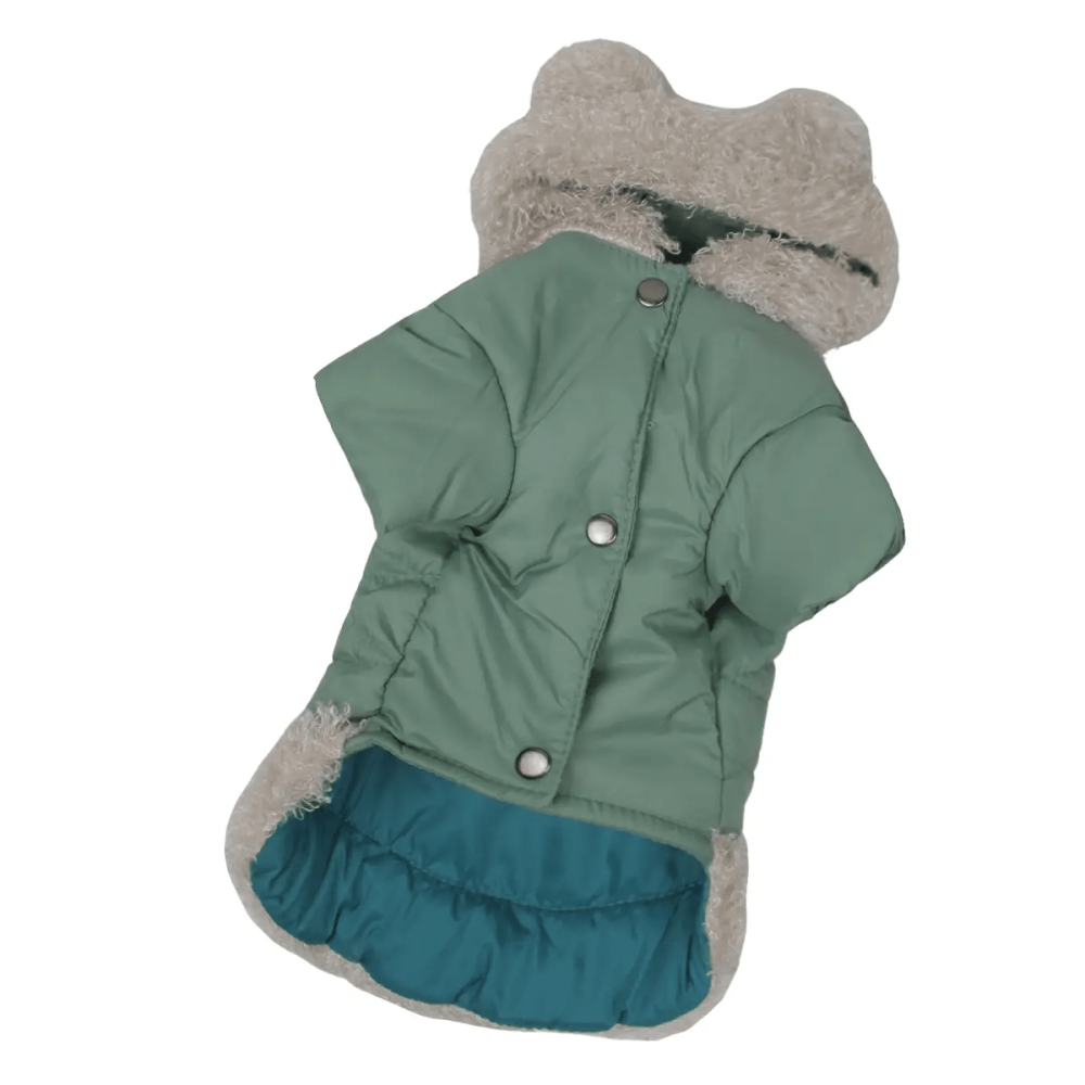 Сочетание плотной плащевки и слоя синтепона надежно защищает животное от ветра и влаги. Особенностью модели является использование плюшевого меха на капюшоне и по низу изделия, что не только украшает куртку, но и создает дополнительный уют.