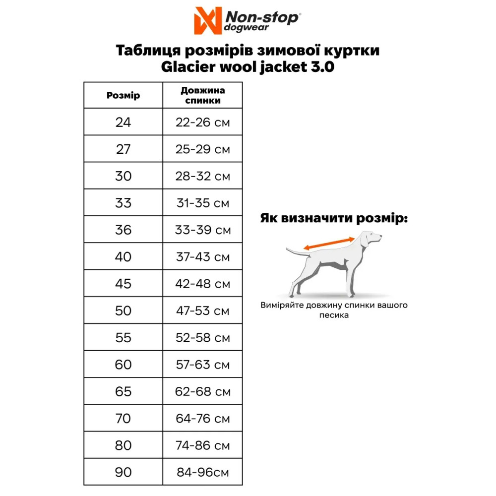 Измерьте длину спины от лопаток до основания хвоста. Если собака находится между размерами, Non-stop dogwear рекомендует выбирать больший размер.