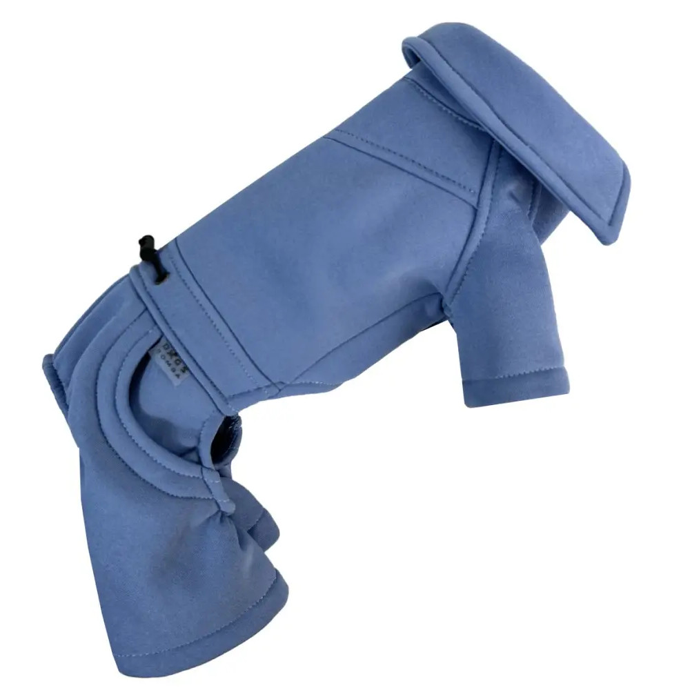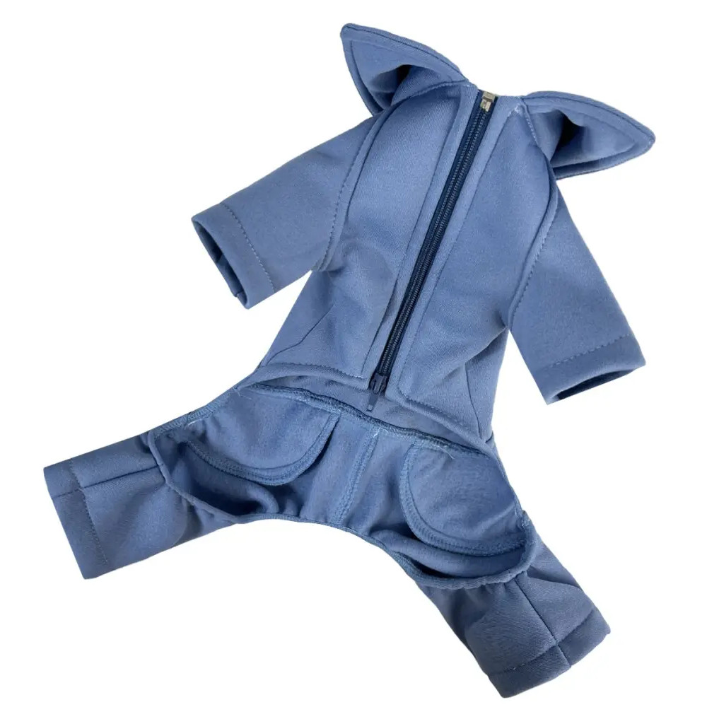 Костюм виконаний з трикотажної тканини трьохнитки з теплим флісовим підкладом, який захищає від прохолоди та забезпечує затишок. Завдяки зручній блискавці на животі костюм легко вдягається, а регулювання об’єму грудей дозволяє підігнати його під індивідуальні параметри собаки. Унікальний крій зі штанами-кльош виглядає стильно та додає особливого шарму на прогулянках.