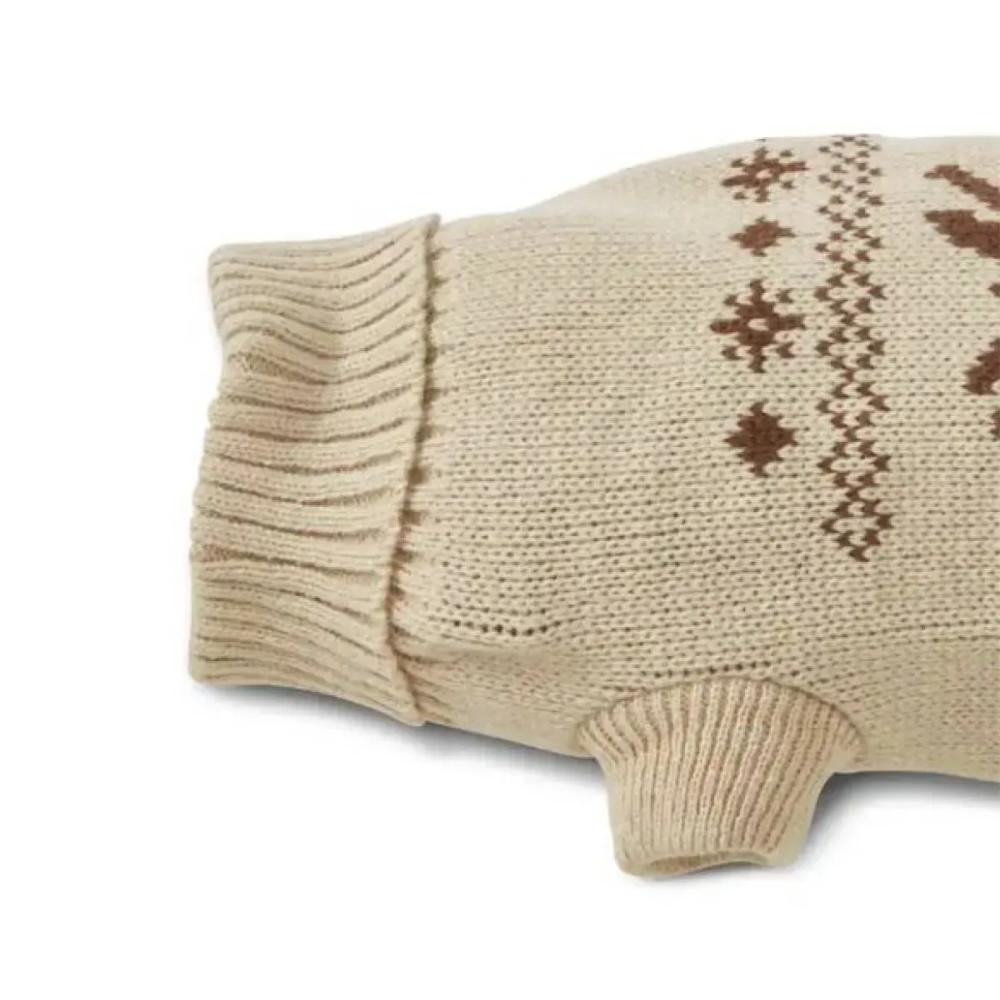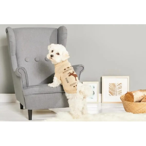 Wolters Moose — в’язаний светр для собак у бежевому кольорі з жакардовим візерунком лося. Високий гольф захищає шию, еластичне в’язання м’яко сідає на корпус і не сковує рухів. Добре підходить для прогулянок у прохолодну погоду та для затишку вдома.